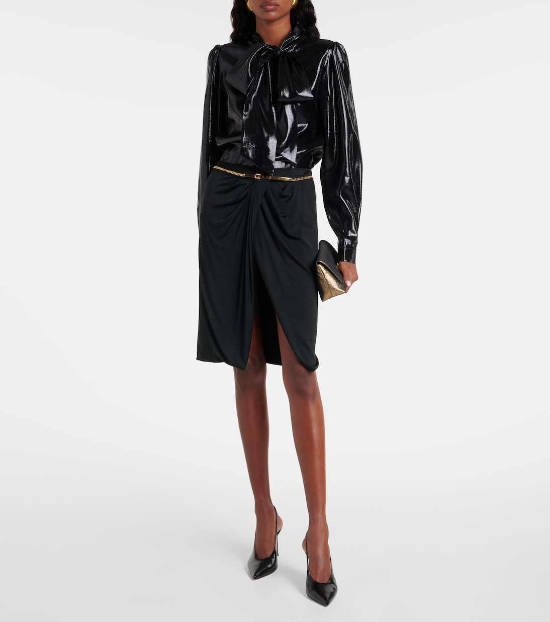 Self-Portrait завоевала огромную популярность благодаря своей мягкой и женственной эстетике. Эта блузка с металлическим блеском и элегантным бантом на воротнике дополнена потайной застёжкой на пуговицы.
