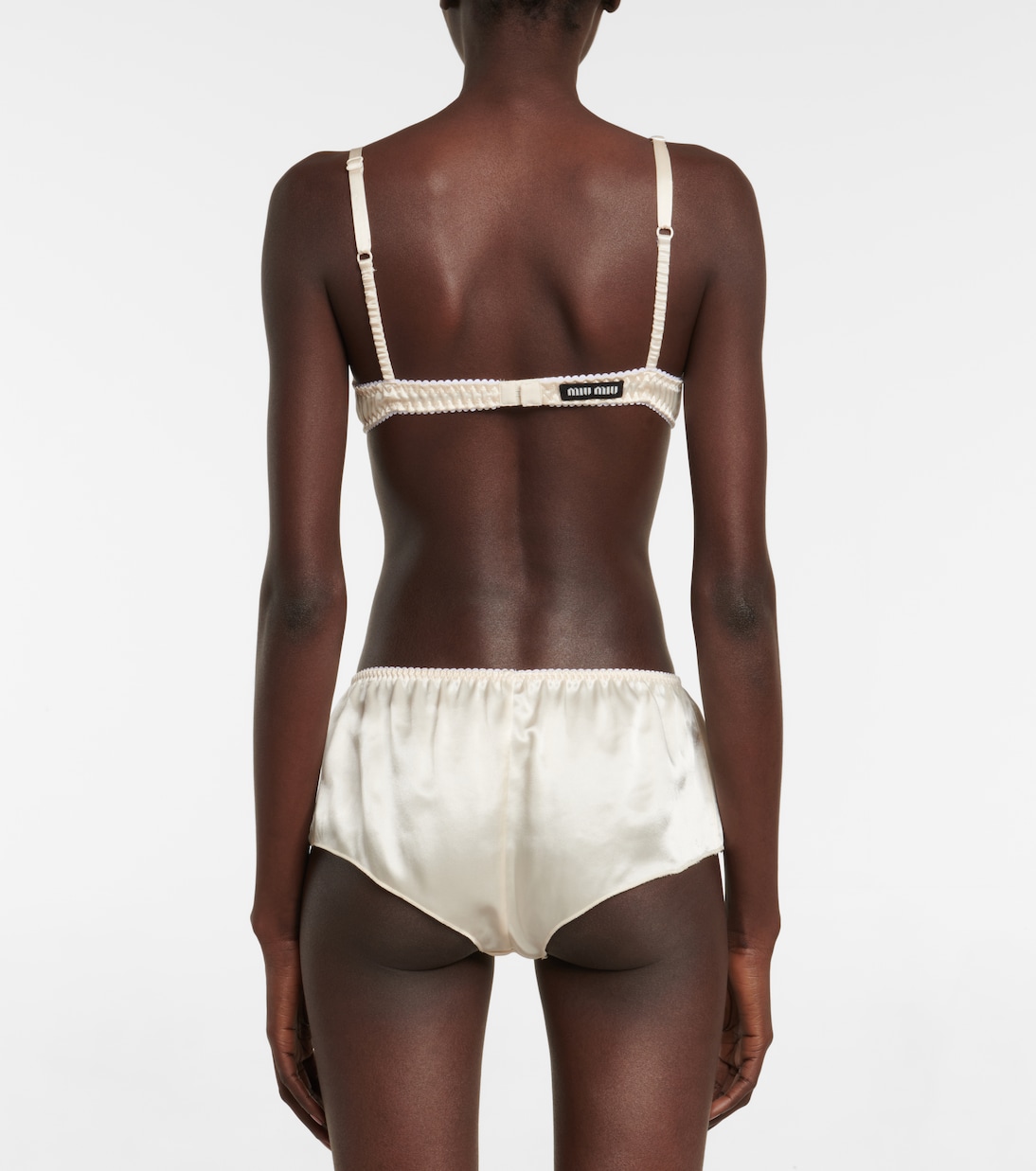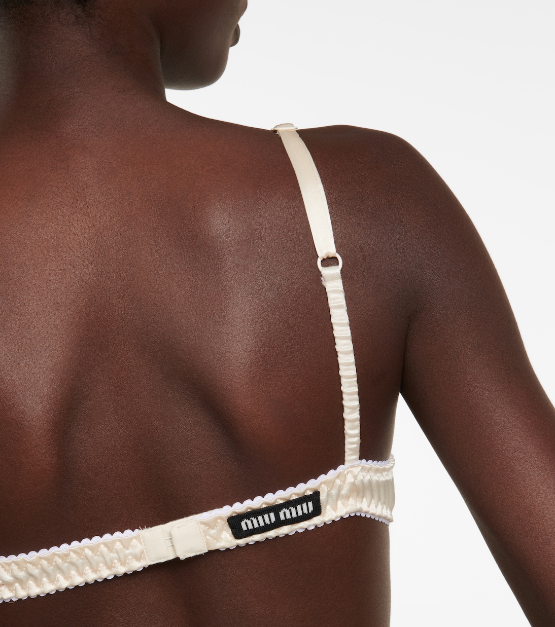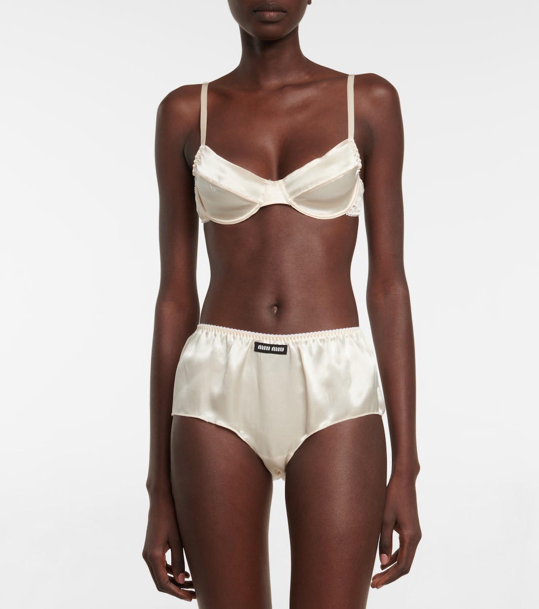Начните свой гламурный образ с самого основания с этим бюстгальтером от Miu Miu. Он выполнен из блестящего атласа на косточках и имеет рюши по бокам.