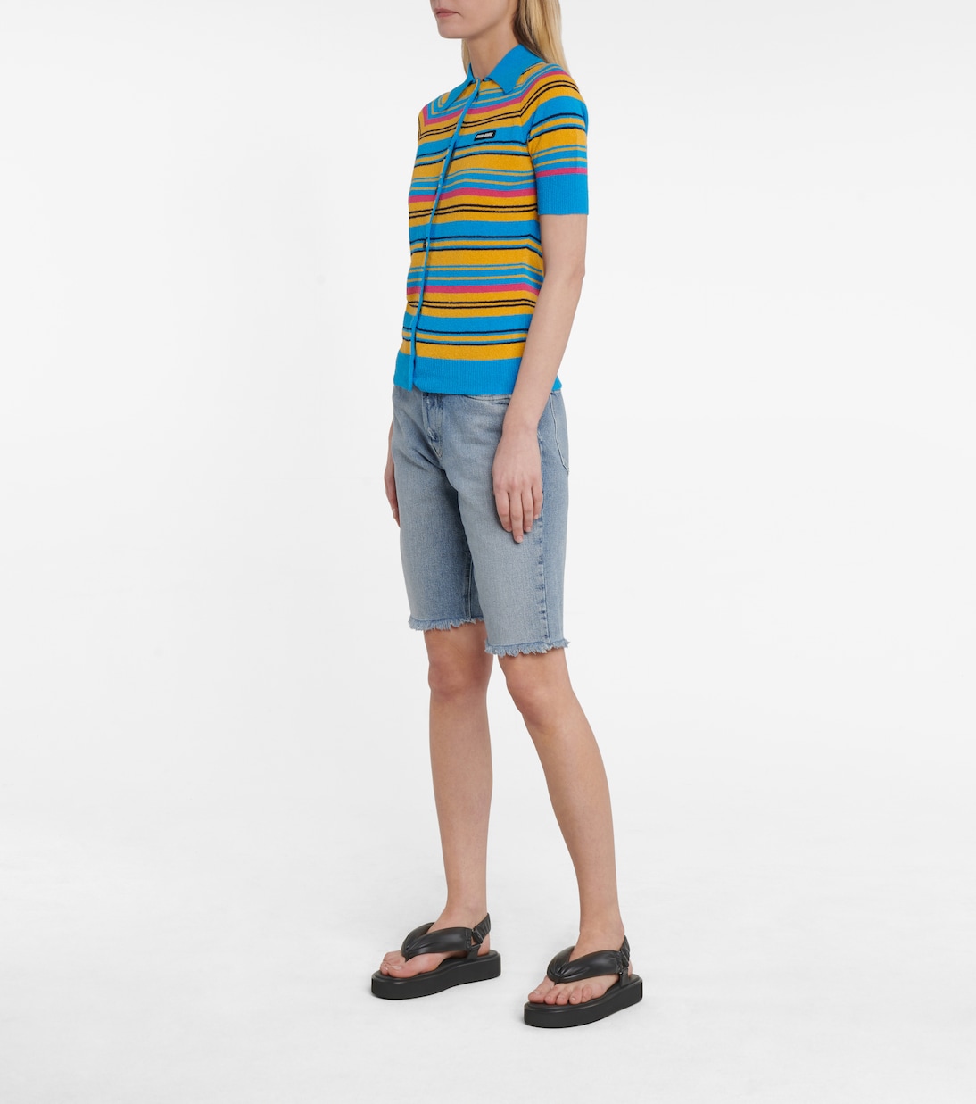 Нашим редакторам понравились эти босоножки Miu Miu, ведь они идеально сочетают в себе выразительный стиль и комфорт. Они оснащены высокой плоской подошвой и имеют мягкие чёрные ремешки-вставки с эластичным ремешком сзади. Дополните их одним из платьев бренда с цветочным принтом, чтобы создать типичный образ Miu Miu.