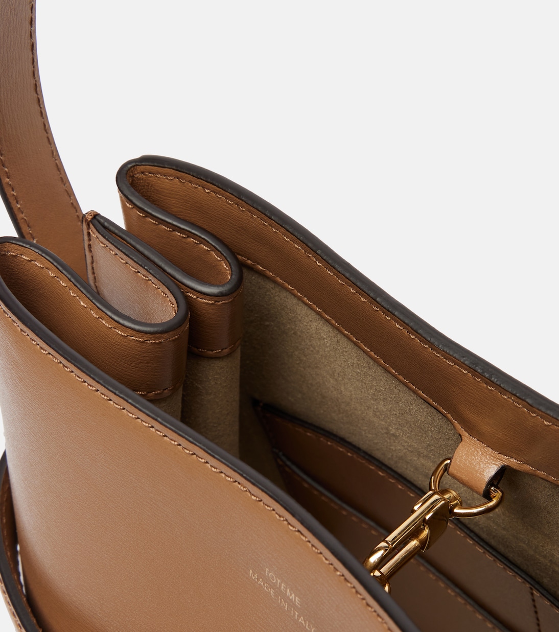 Эта сумка-ведро от Toteme, изготовленная из кожи, дополнена золотистой фурнитурой и регулируемым ремнем, который позволяет регулировать ширину. Сумка дополнена замшевой подкладкой, двумя внутренними накладными карманами и плечевым ремнем для удобства переноски.