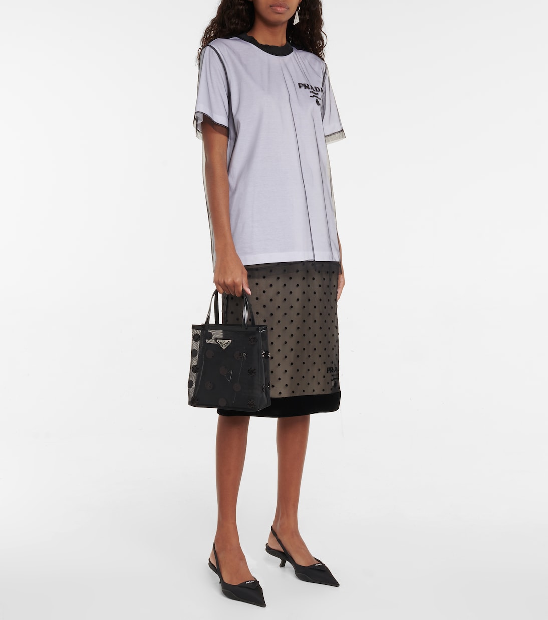 Эта сумка-тоут с пайетками в горошек, давшая Prada долгую жизнь, воплощает свою давнюю любовь к сетке. Полупрозрачная модель небольшого размера дополнена отделкой из матовой телячьей кожи и вмещает практичный кармашек. Треугольные пластины с логотипом делают сумку узнаваемой.