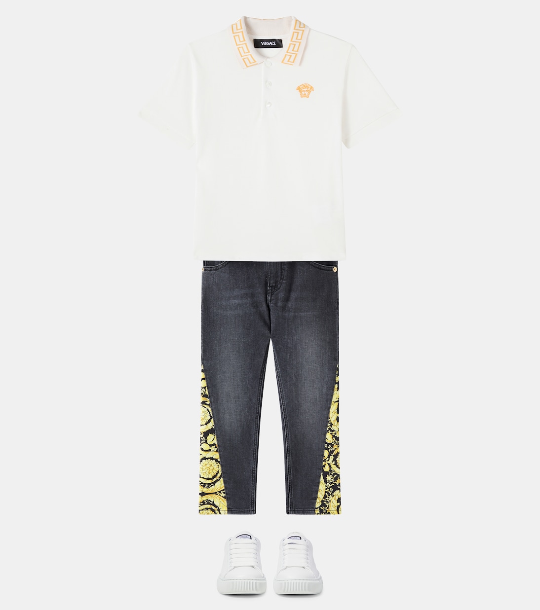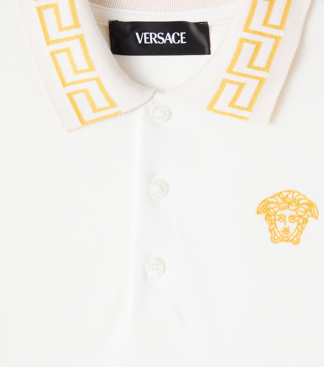 Versace Kids предлагает яркий дизайн минималистичных моделей с фирменным мотивом La Greca – символом единства и бесконечности. Эта поло из хлопкового пике дополнена вышитым логотипом Medusa и застёжкой на пуговицы спереди.