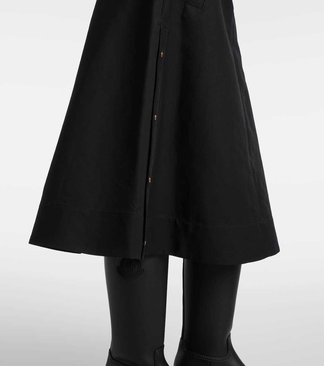 Эта хлопковая юбка миди от Moncler классического А-силуэта с регулируемыми боковыми разрезами и съёмным поясом дополнена застёжкой-молнией, боковыми карманами и изящной нашивкой с логотипом.