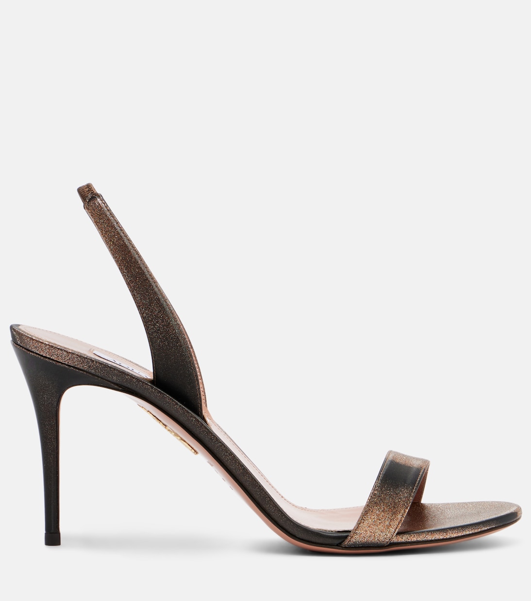 Обувь Aquazzura – это творение любви: одна пара может состоять из более чем 30 компонентов, каждый из которых собирается вручную опытными мастерами. Босоножки So Nude с металлизированным кожаным верхом отличаются изящным силуэтом и каблуком высотой 85 мм.