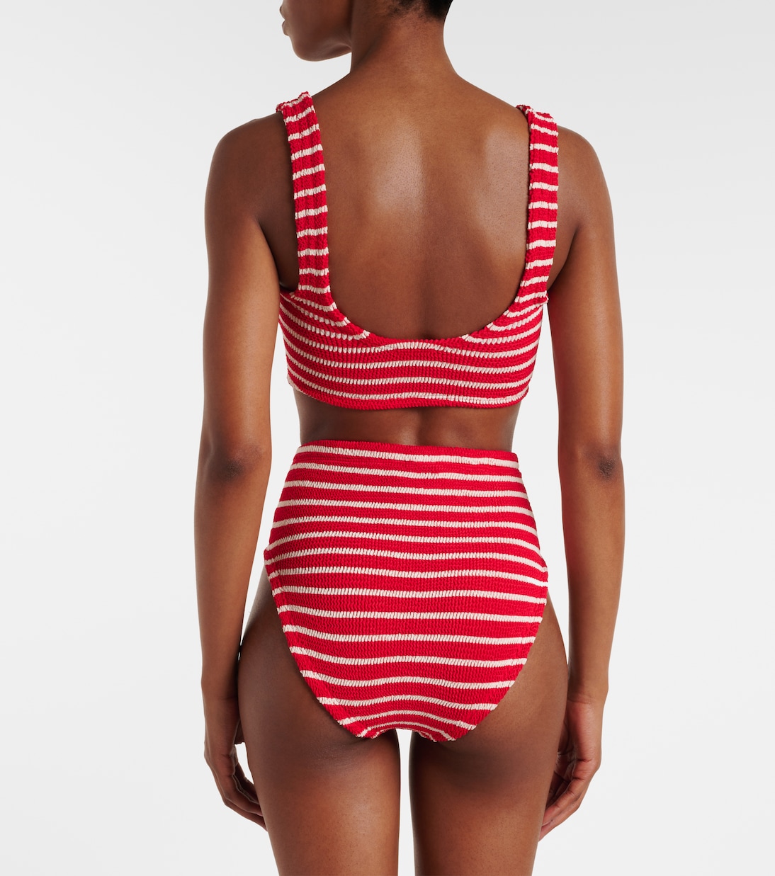 Бикини Nadine украшено кольцеобразной деталью прямо по центру груди. Этот полосатый купальник изготовлен по технологии Seamless Crinkle от Hunza G, что делает его универсальным.