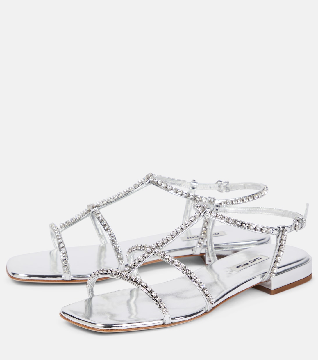 Эти босоножки от Miu Miu с ремешками, украшенными кристаллами, превратят ваш образ из повседневного в гламурный. Они на плоской подошве с гладкой кожаной стелькой.