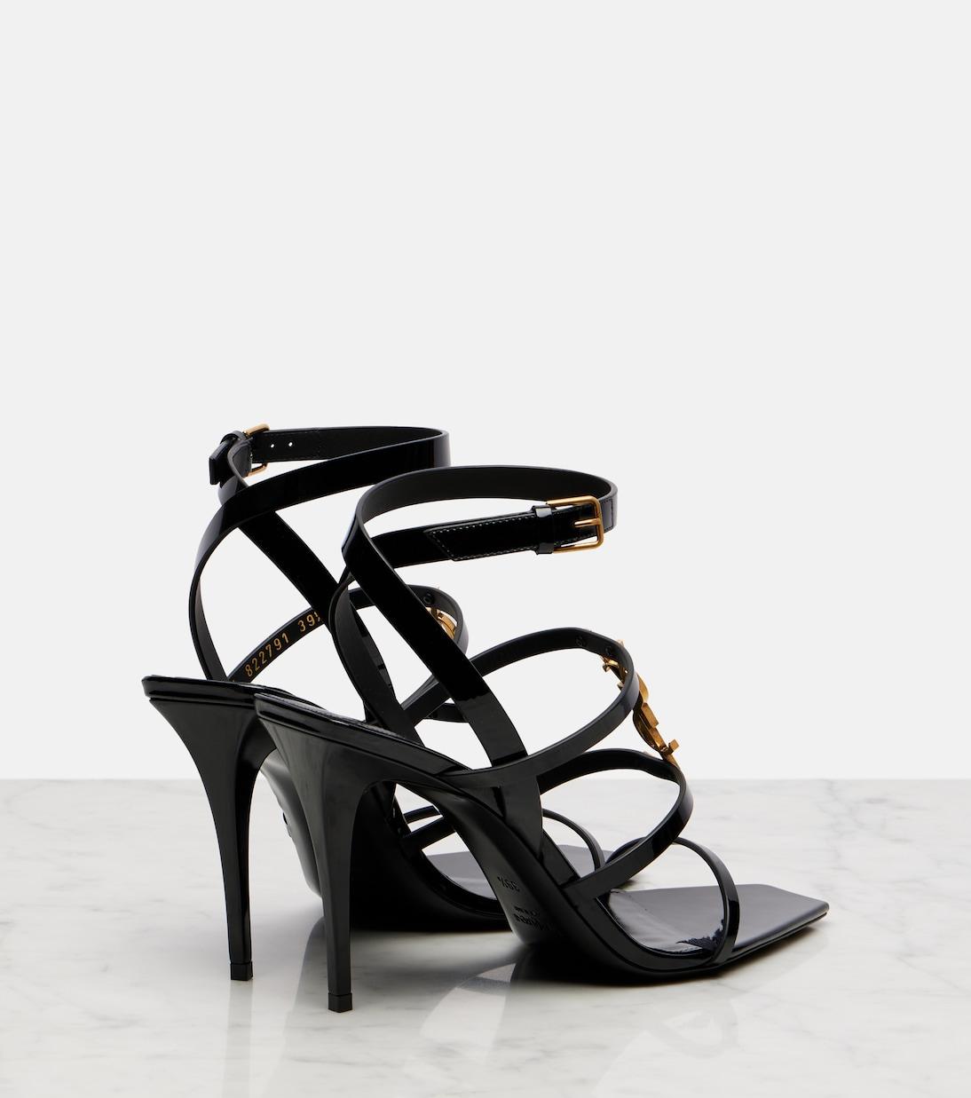 Эти босоножки с ремешками от Saint Laurent изготовлены из лакированной кожи и украшены золотистой фурнитурой Cassandre спереди. Квадратный носок и лакированные каблуки-шпильки высотой 90 мм.