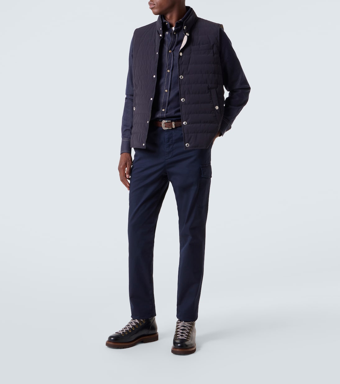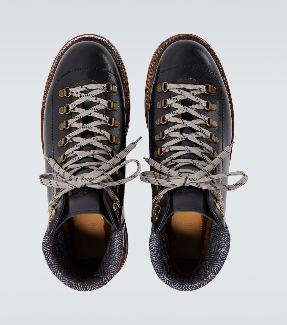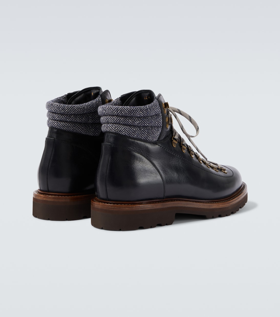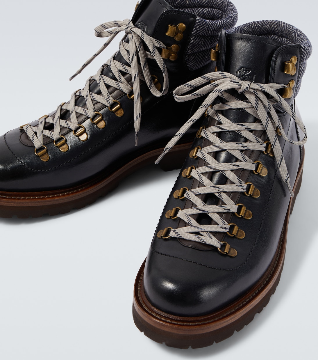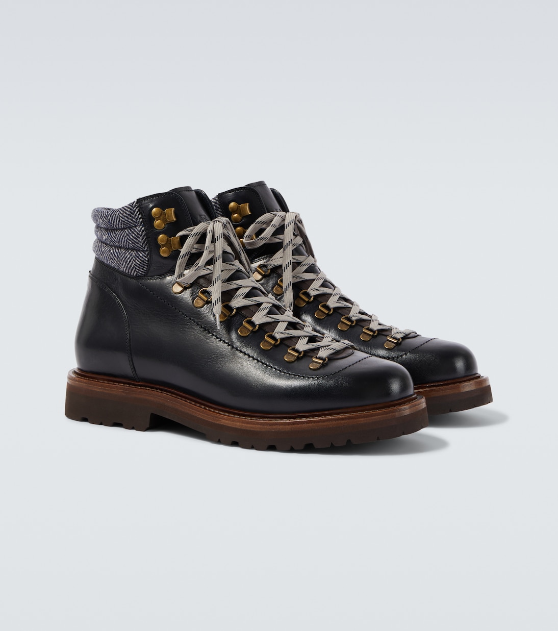 Эти ботинки от Brunello Cucinelli выполнены в горном стиле, который дополняет повседневные образы изысканностью. Модель выполнена из кожи и дополнена спортивными деталями, такими как мягкая подкладка, металлические D-образные кольца и двухцветные шнурки.
