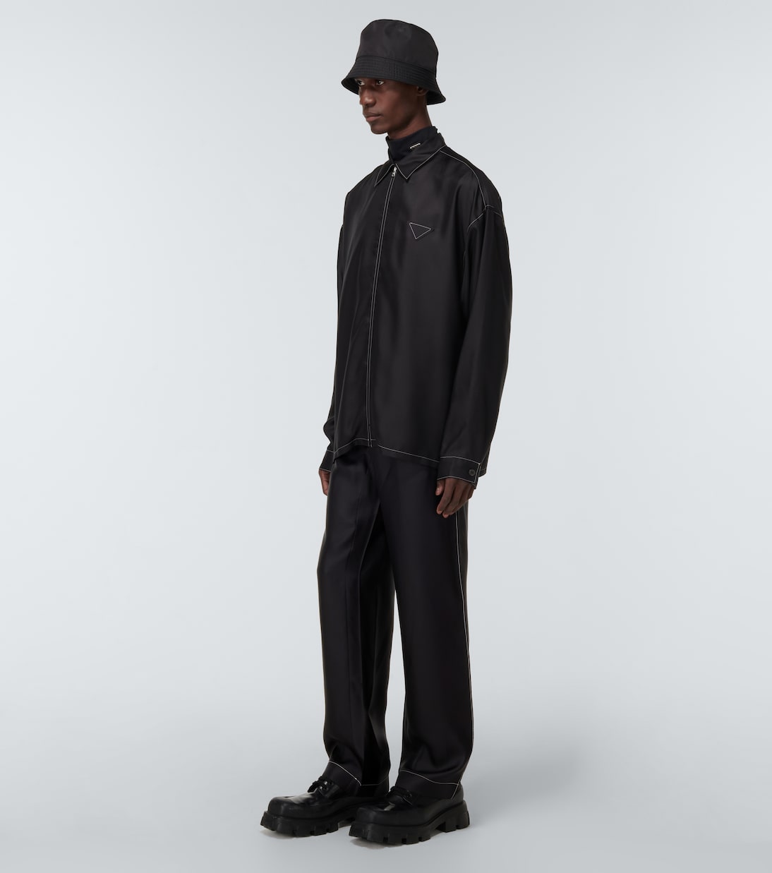 Эти брюки Prada изготовлены в Италии из 100% шёлка. Свободный, широкий силуэт с контрастной строчкой. Боковые карманы и накладной карман сзади украшены тканевым треугольным логотипом.
