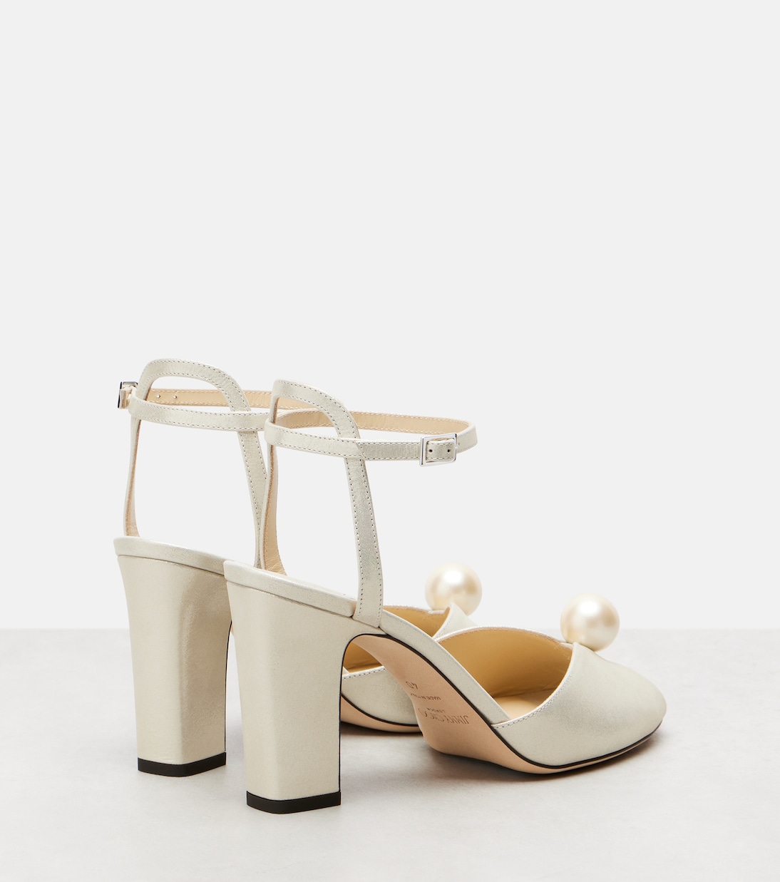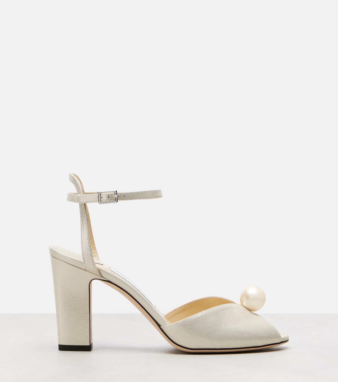 Босоножки Sacaria от Jimmy Choo, изготовленные в Италии из кожи, с кожаными стельками и подошвами, с открытым миндалевидным носком. Модель украшена жемчужинами спереди.
