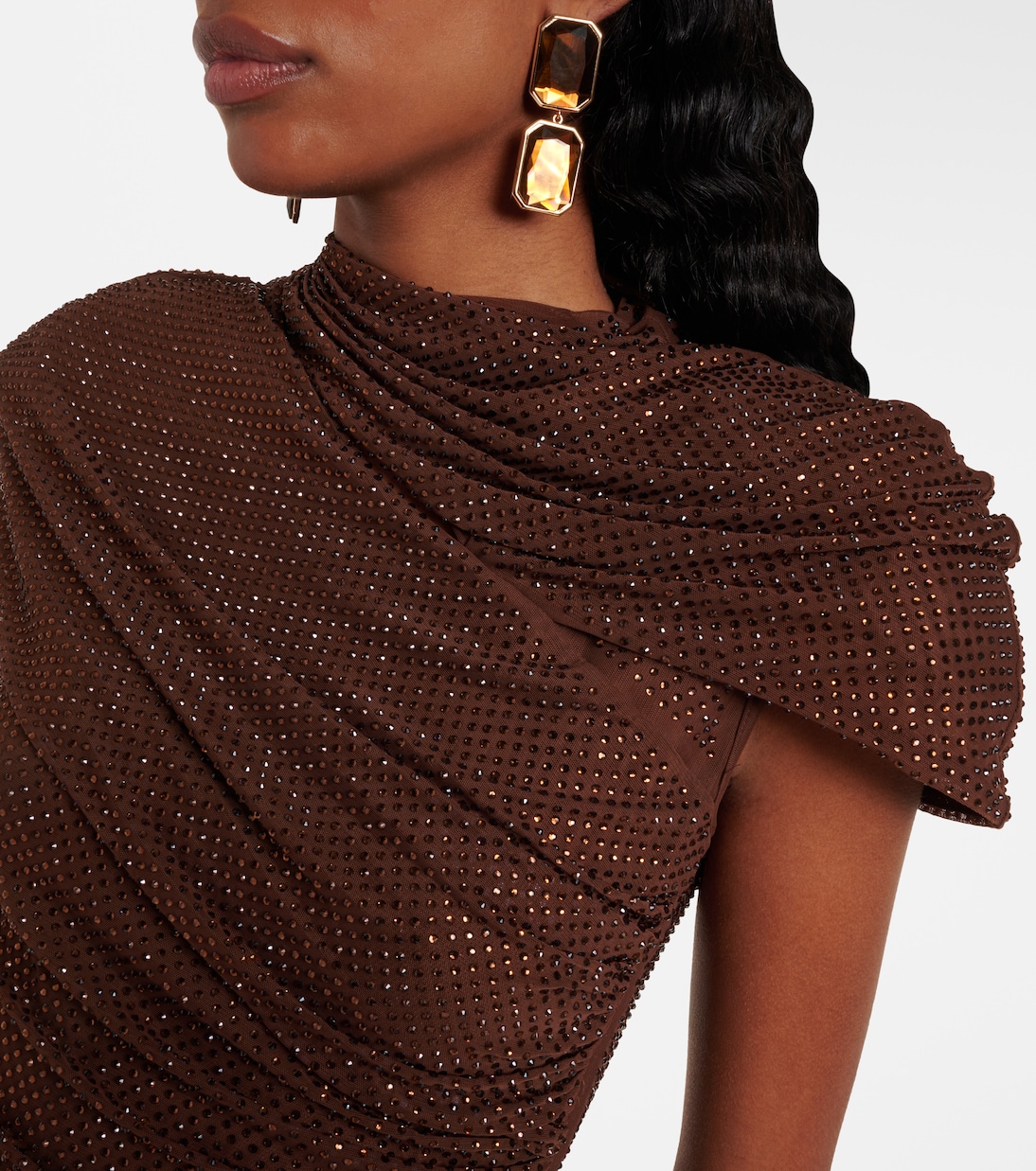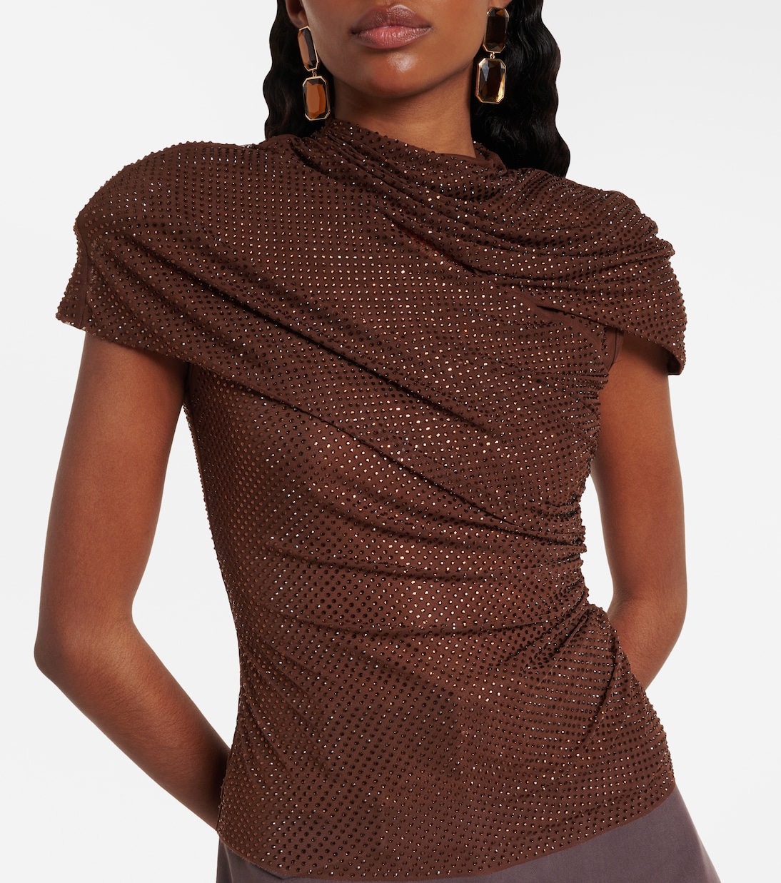 Топ из сетки с драпировкой и кристаллами Self-Portrait, коричневый