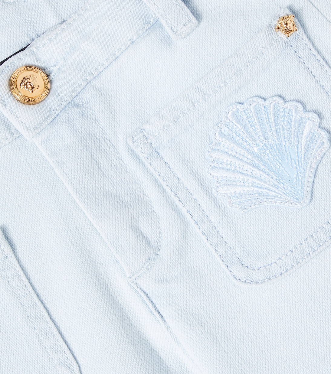 Эти джинсы Versace Kids сделают каждый день идеальным. Модель с высокой талией, свободными штанинами и вышитой ракушкой на кармане.