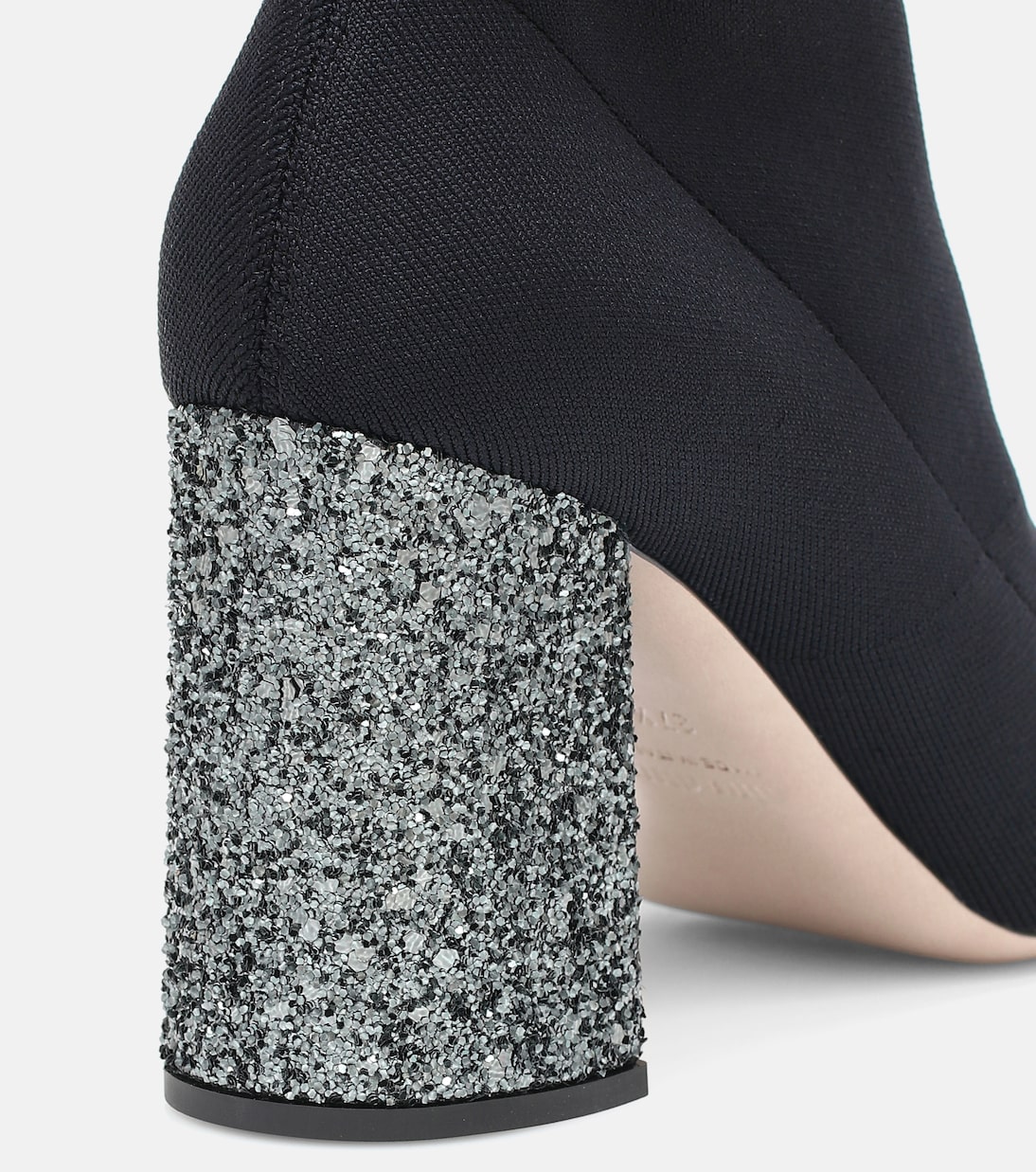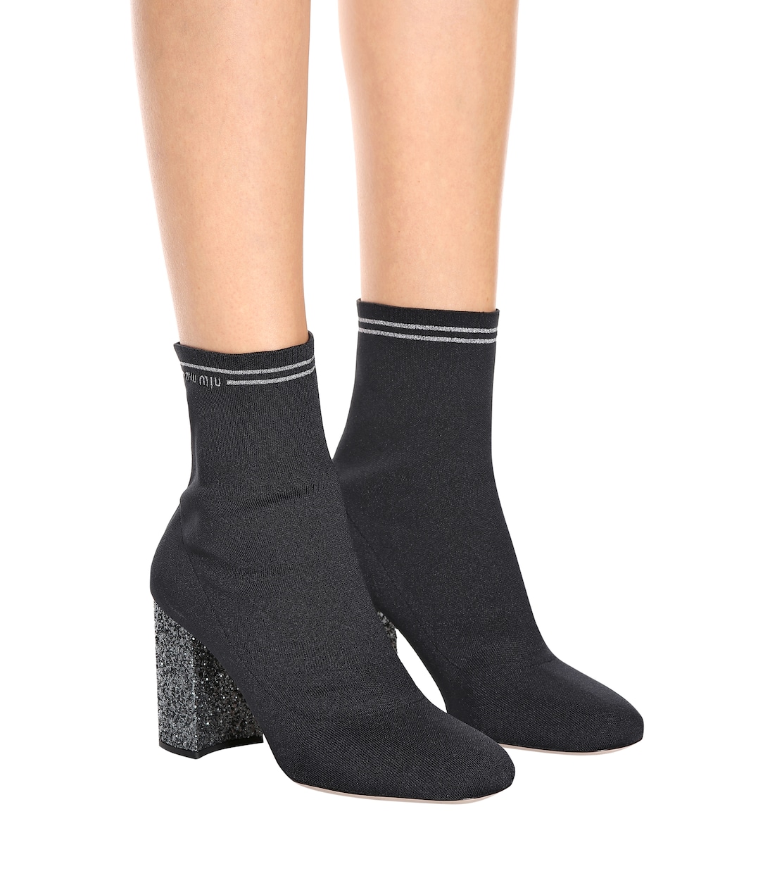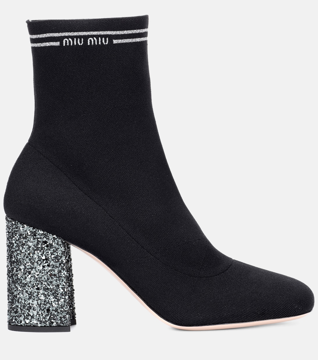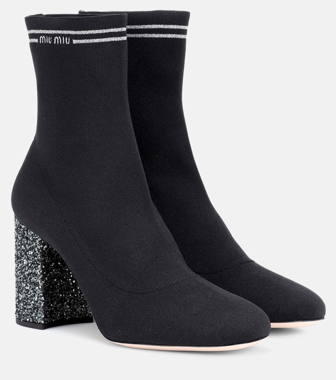 Ботинки Miu Miu выглядят гламурно благодаря эластичному трикотажному верху черного цвета и яркому синему блочному каблуку с блестками. Полоски и логотип бренда на горловине придают модели спортивный акцент, а фирменное использование мерцающих блесток возносит пару до уровня люкса. Мы считаем, что они выглядят невероятно шикарно в сочетании с маленьким черным платьем или с клетчатыми изделиями бренда в стиле панк, создавая городской образ.