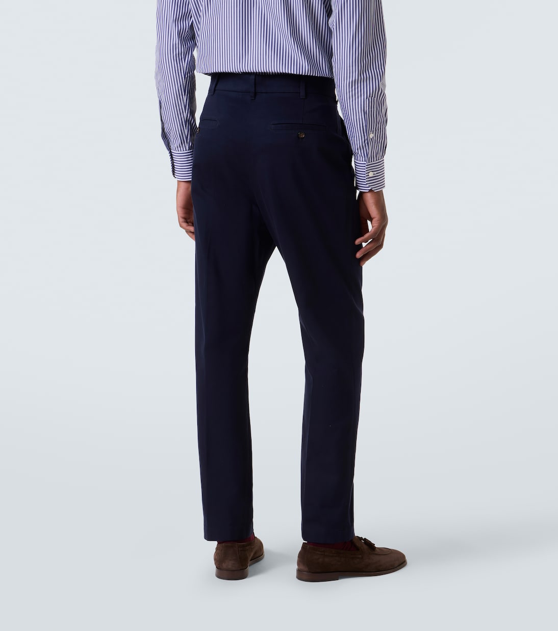 Эти зауженные брюки Dunhill, воплощающие изысканность и непреходящую британскую элегантность, изготовлены из мягкой и прочной хлопковой ткани. Модель темно-синего цвета с практичными боковыми прорезными и задними карманами идеально подходит для повседневной носки.