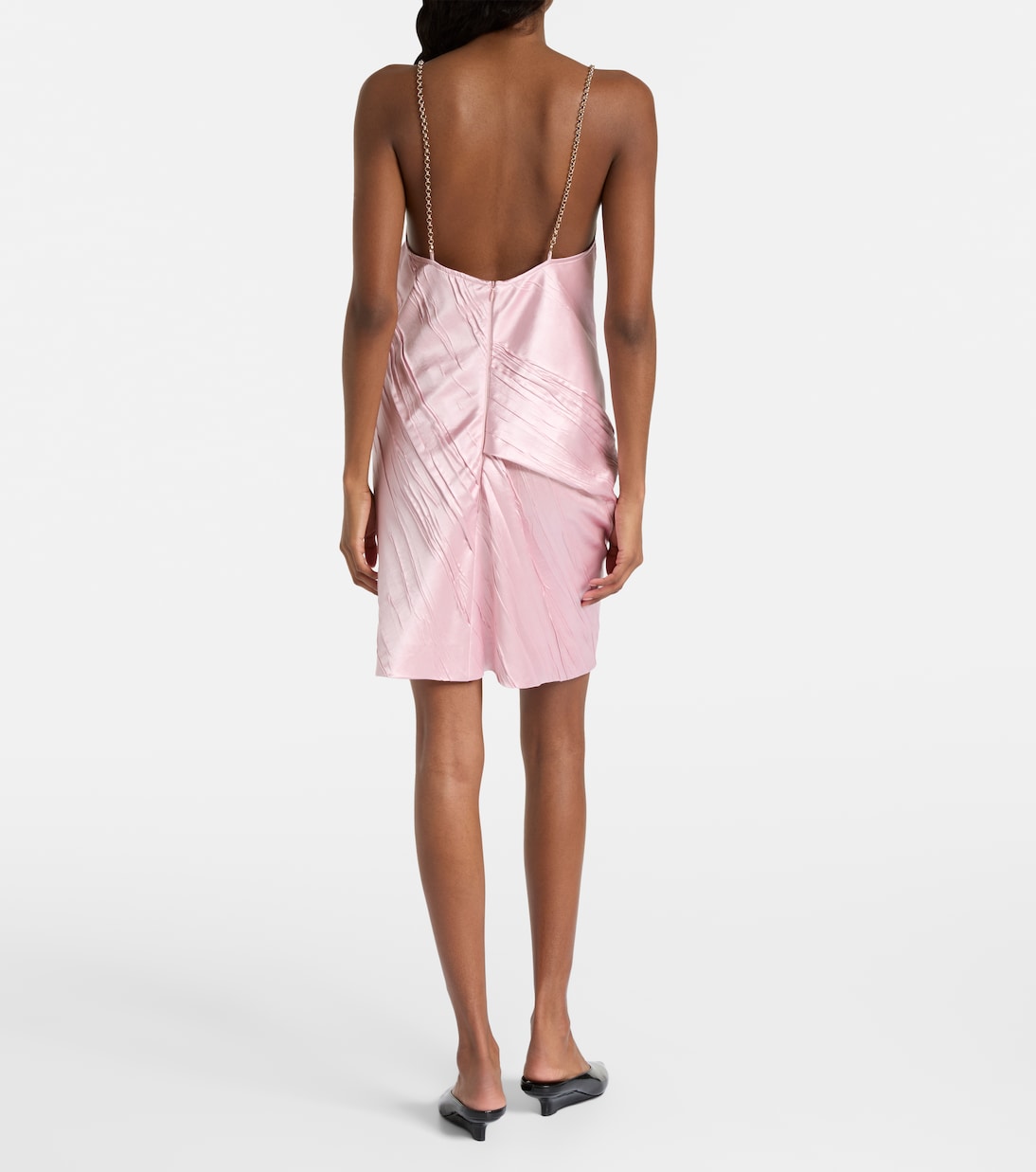 Основанный на принципах классического кроя и экспериментов, бренд Sportmax сочетает современный городской стиль со спортивными силуэтами. Мини-платье Carta из розового атласа отличается плиссированными деталями по всей поверхности и золотистыми цепочками-бретельками.