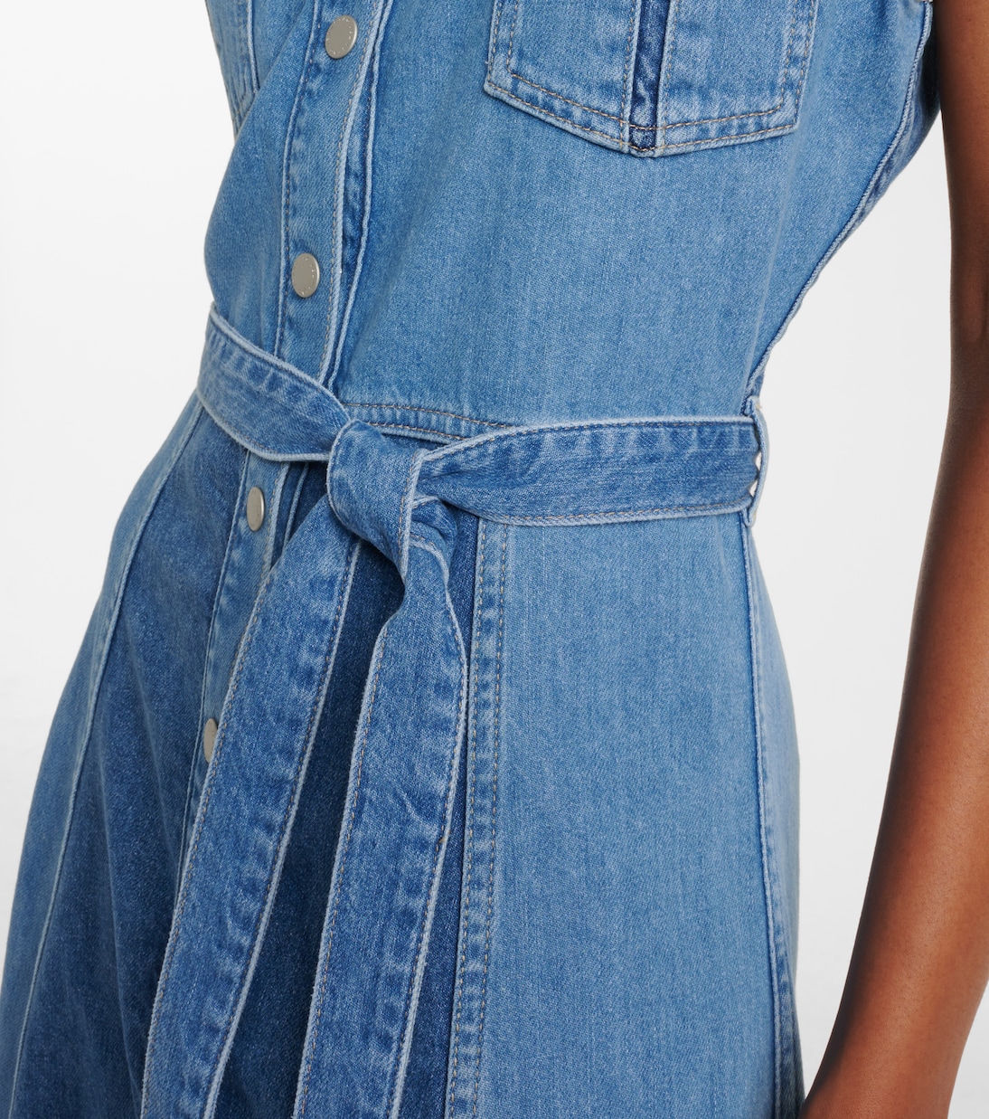 Бренд AG Jeans, основанный в 2000 году, привносит современный взгляд на классические джинсовые модели. Это миди-платье из денима с поясом отличается вставками разных оттенков.
