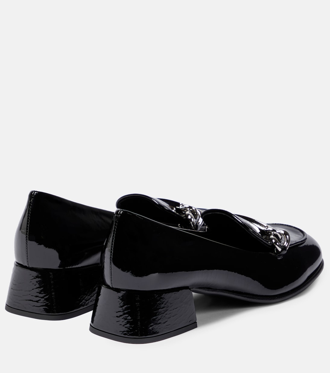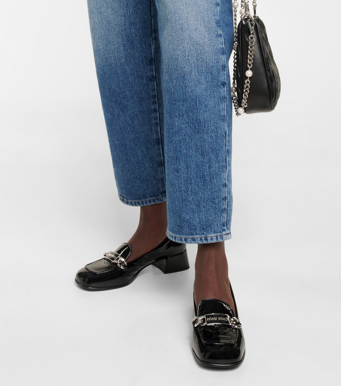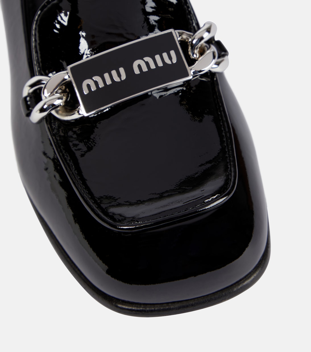 Эти лоферы от Miu Miu гармонично сочетают в себе андрогинность и женственность. Они выполнены из лакированной кожи с расклешенным каблуком и украшены цепочкой с логотипом.