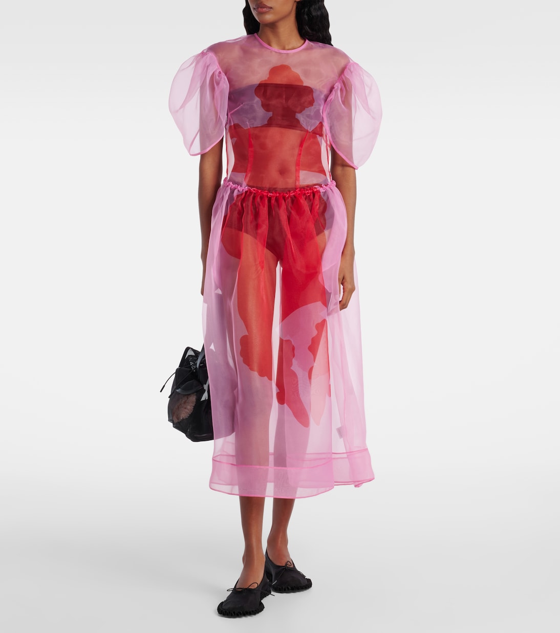 Будьте неотразимы на следующем мероприятии в этом ярком платье миди от Simone Rocha. Платье выполнено из лёгкой органзы и украшено абстрактным принтом. Платье отличается струящимся силуэтом и объёмными рукавами.