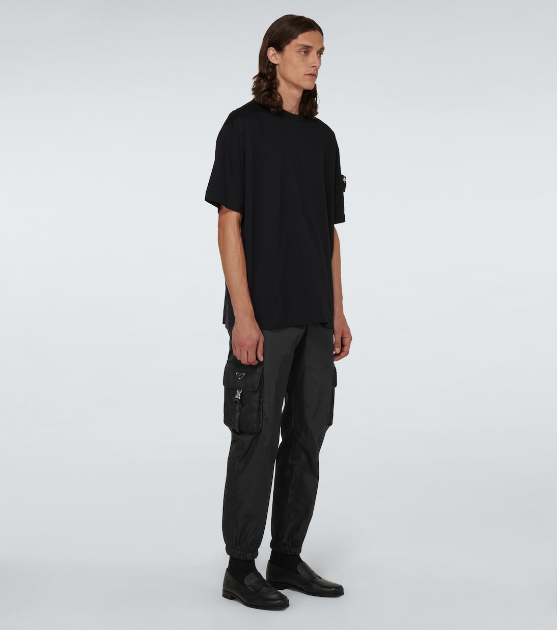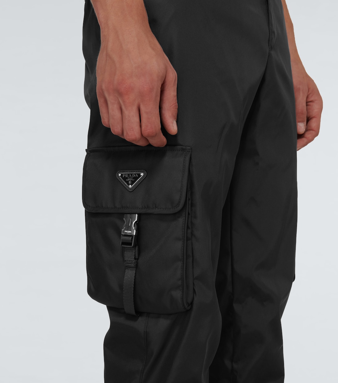 Эти свободные брюки-карго Prada, изготовленные в Италии из экологически чистого материала Re-Nylon черного цвета, имеют эластичные манжеты и украшены эмалированным треугольным логотипом бренда по бокам.