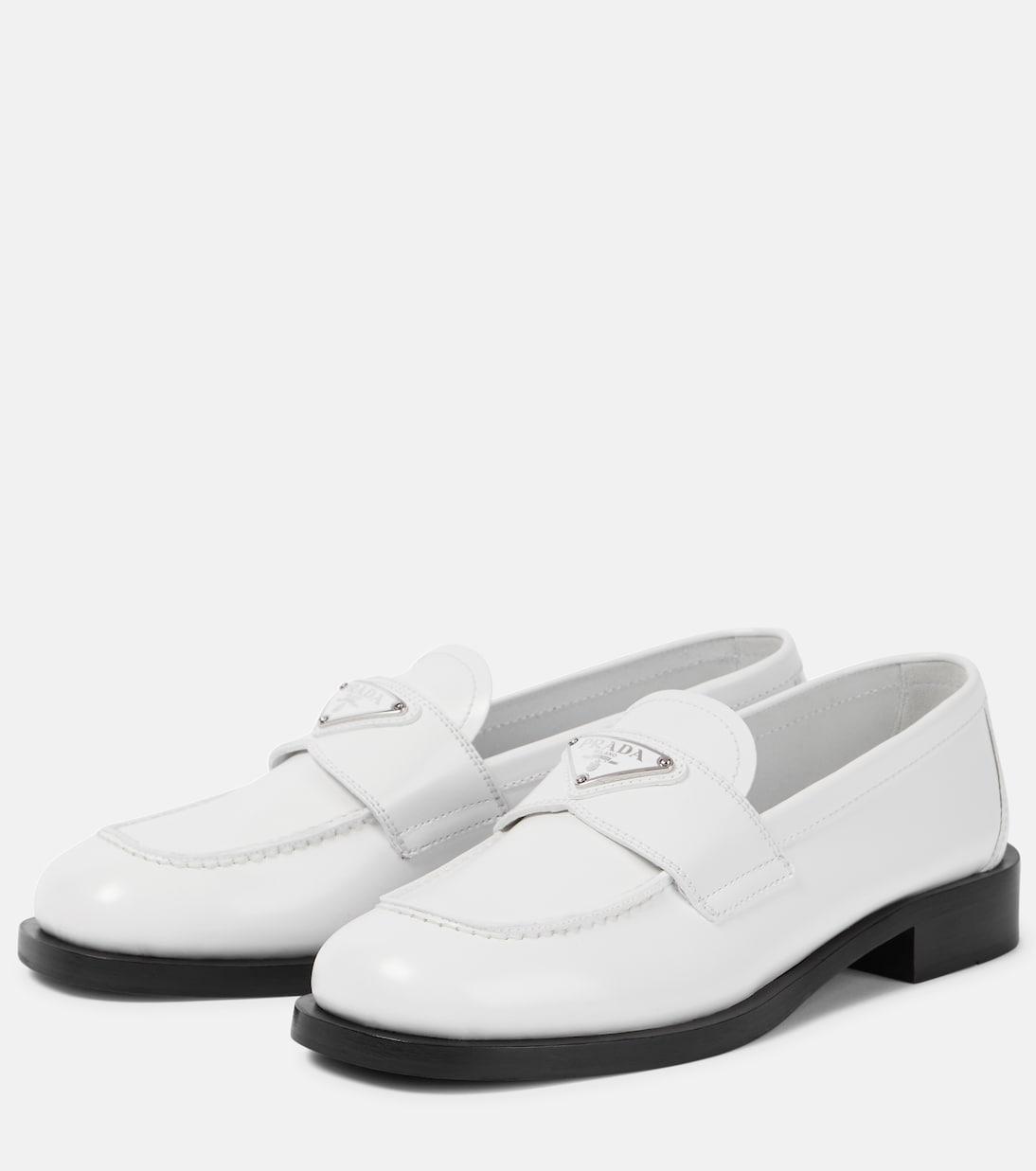 Пара лоферов Prada, украшенных треугольными бляшками с логотипом, — настоящая находка сезона. Эта модель выполнена из матовой белой телячьей кожи с блестящей отделкой.