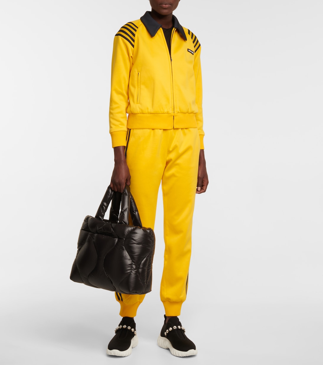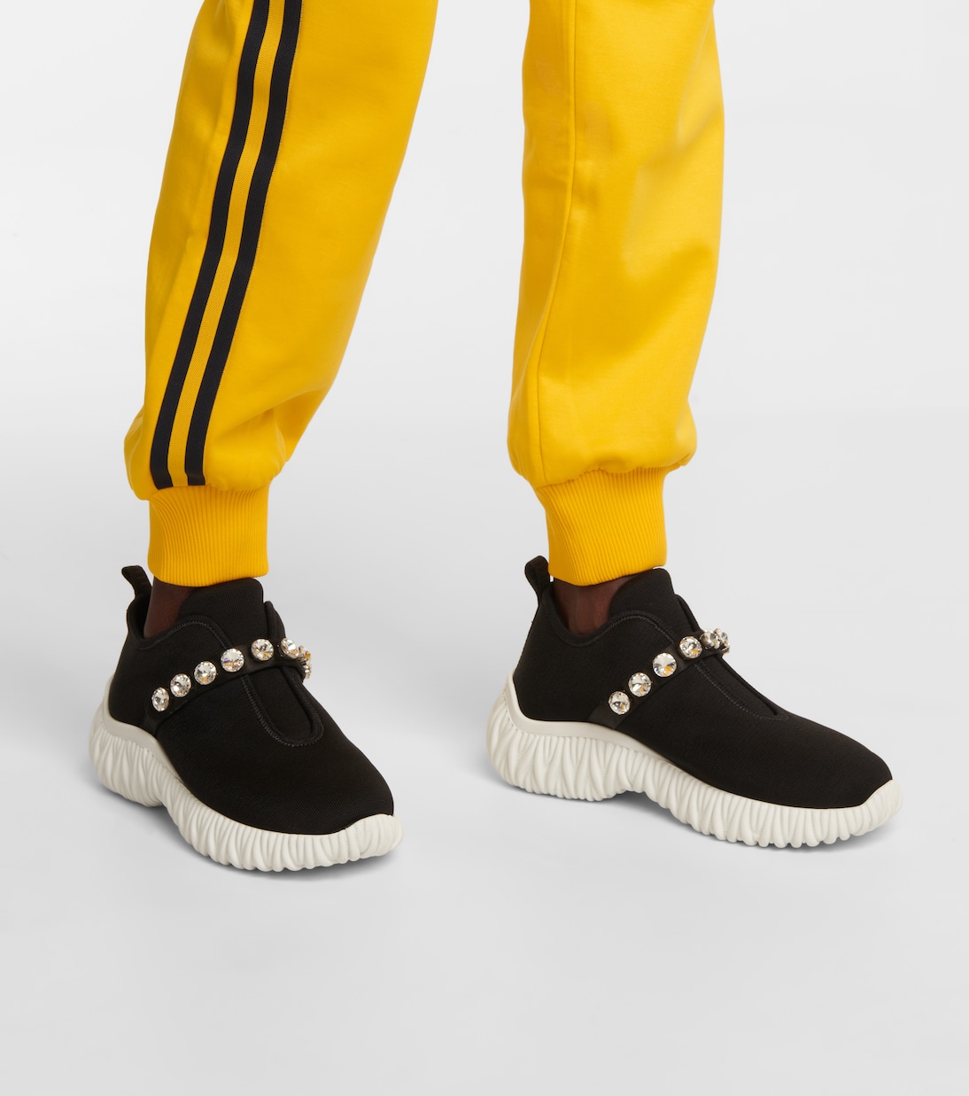 Эти чёрные кроссовки одновременно гламурные и спортивные, в фирменном стиле Miu Miu. Они выполнены из удобного эластичного трикотажного верха, украшенного кристаллами. Текстура белой резиновой подошвы напоминает фирменную стёжку matelassé.