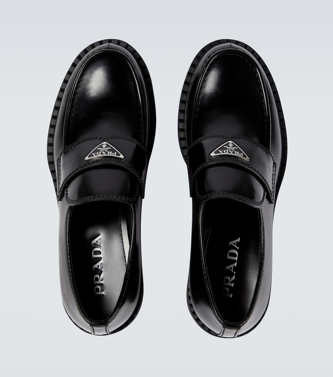 Эти черные туфли Prada, изготовленные в Италии из гладкой шлифованной кожи, имеют рифленую платформенную подошву и украшены эмалированным треугольным логотипом на ремешке.