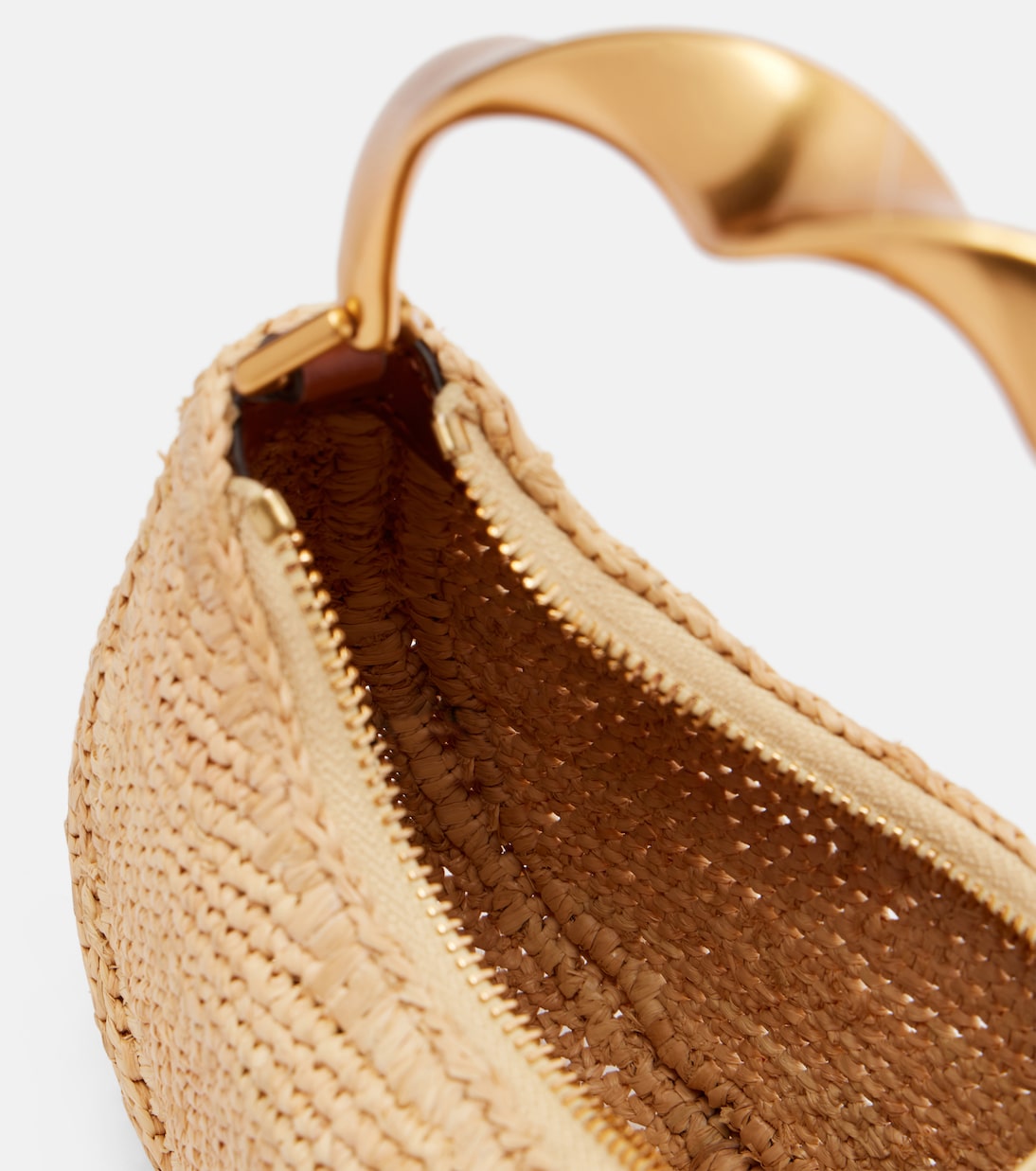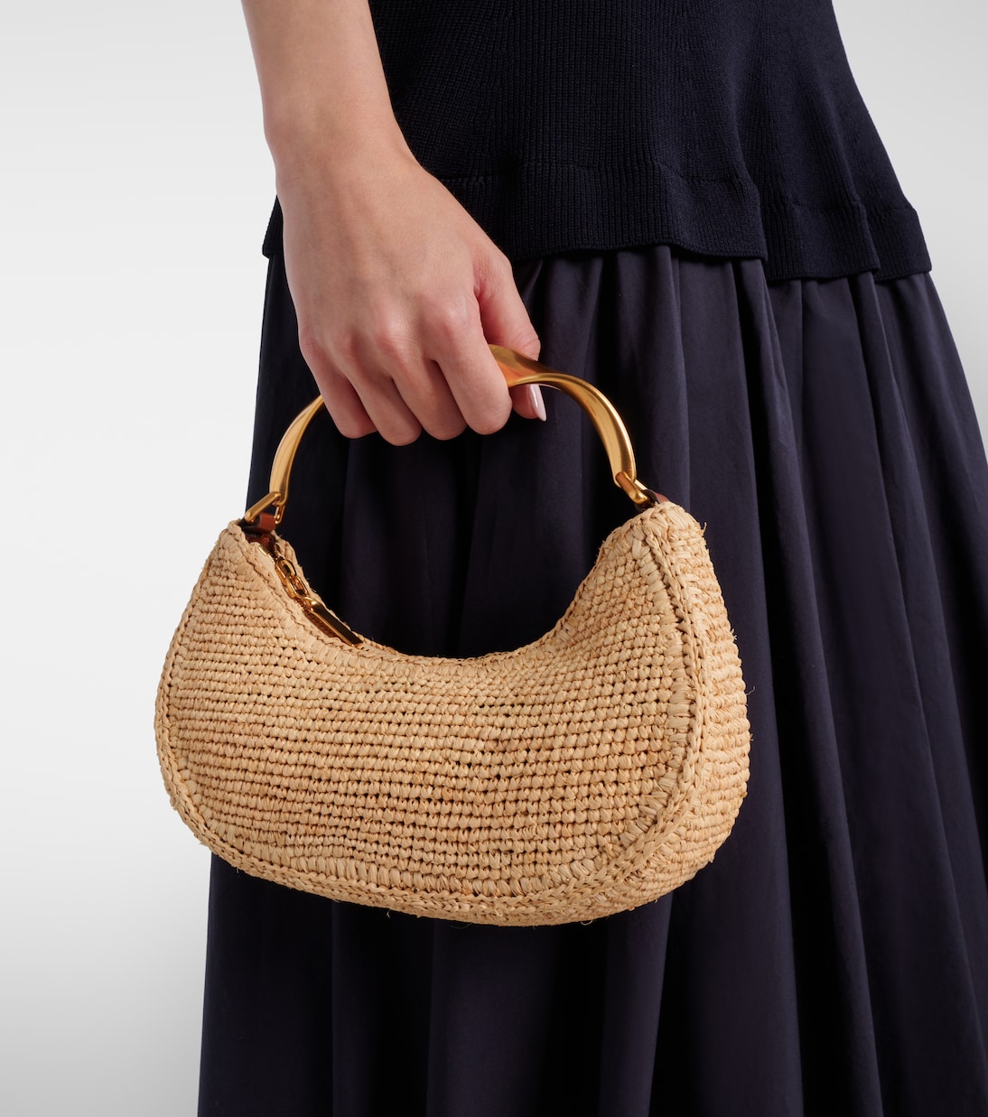 Вдохновляясь скульптурой и архитектурой, Simkhai создает впечатляющие модели, сочетающие инновационные конструкции с ручной проработкой деталей. Сумка-тоут Nixi Mini изготовлена из рафии и дополнена золотистой витой ручкой.