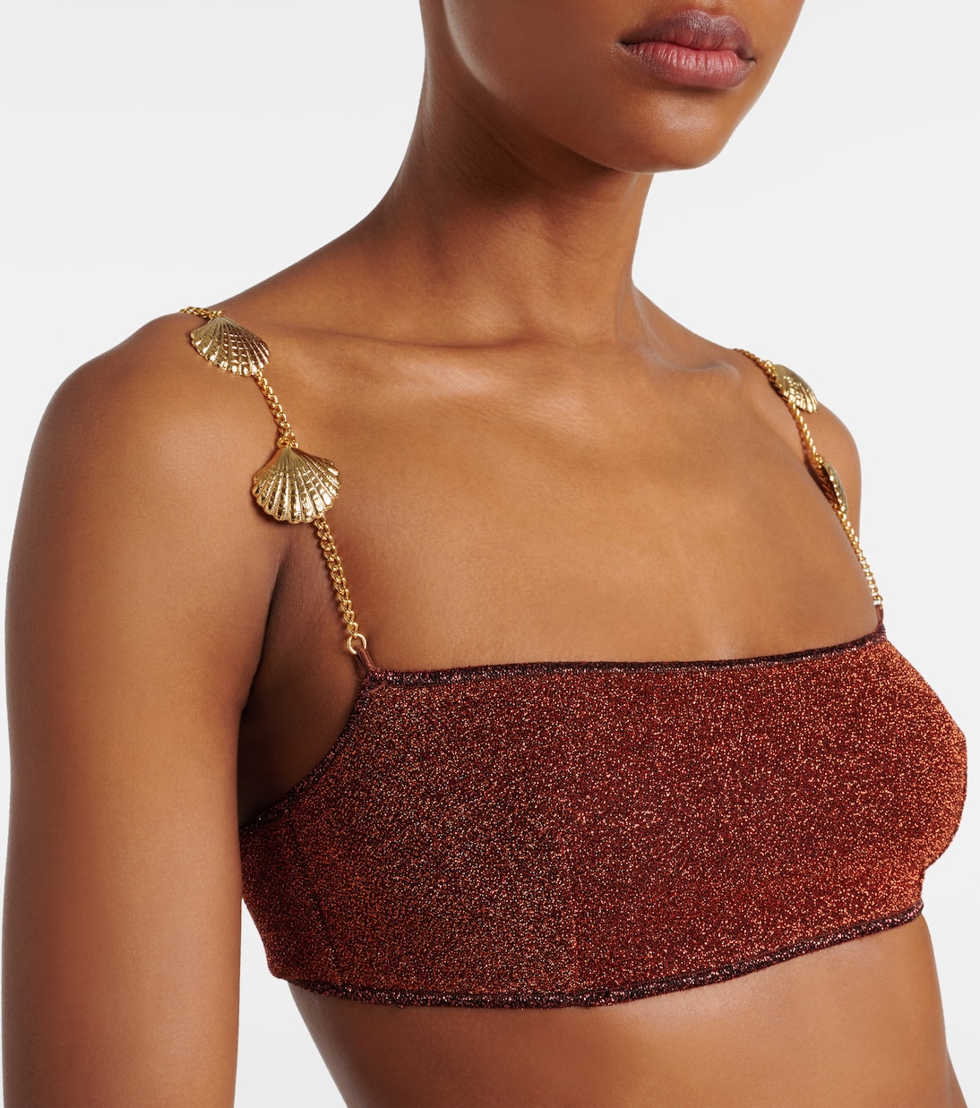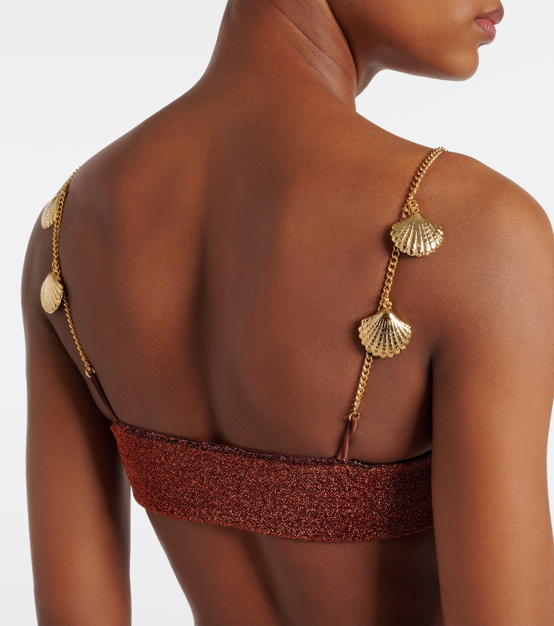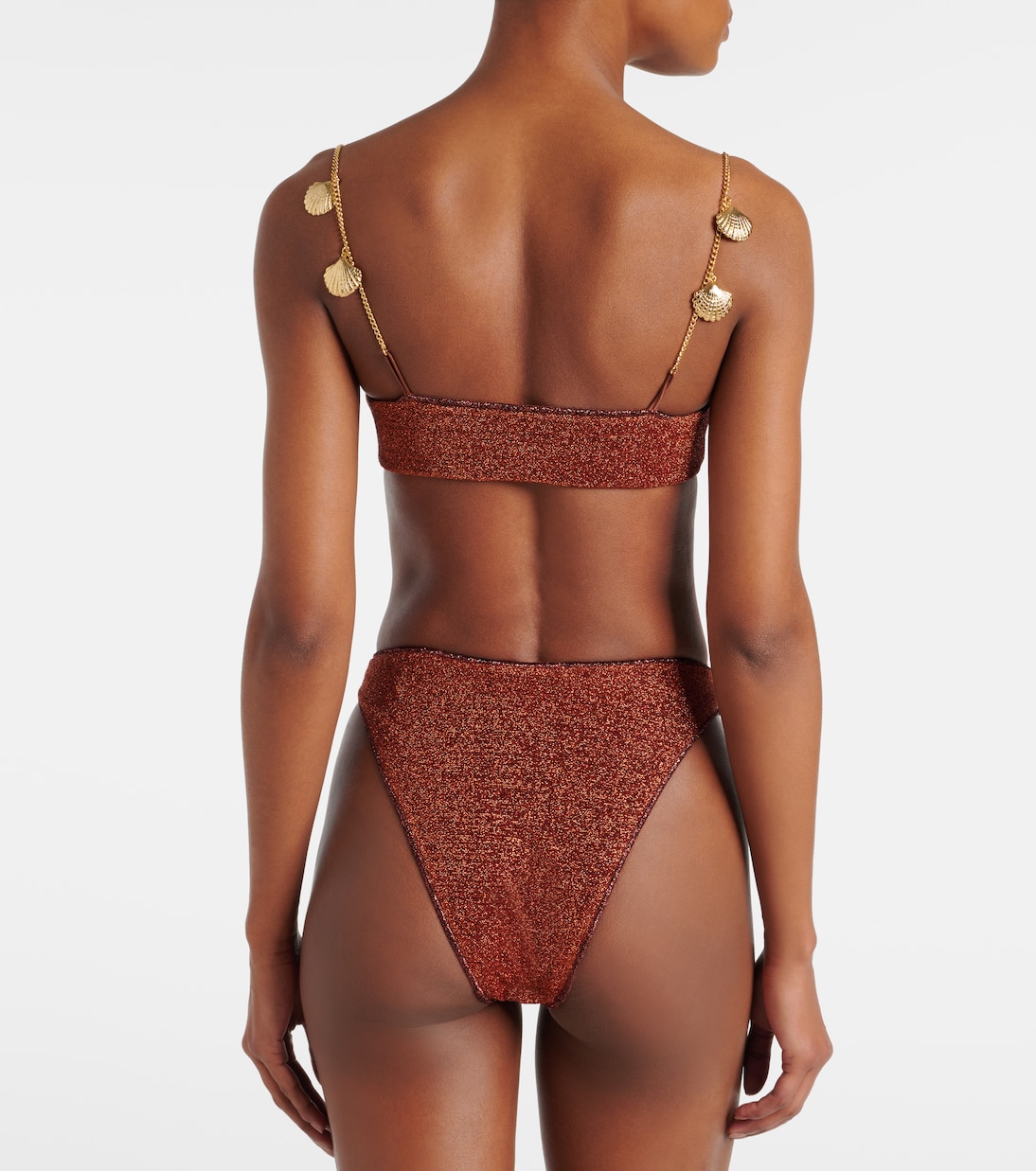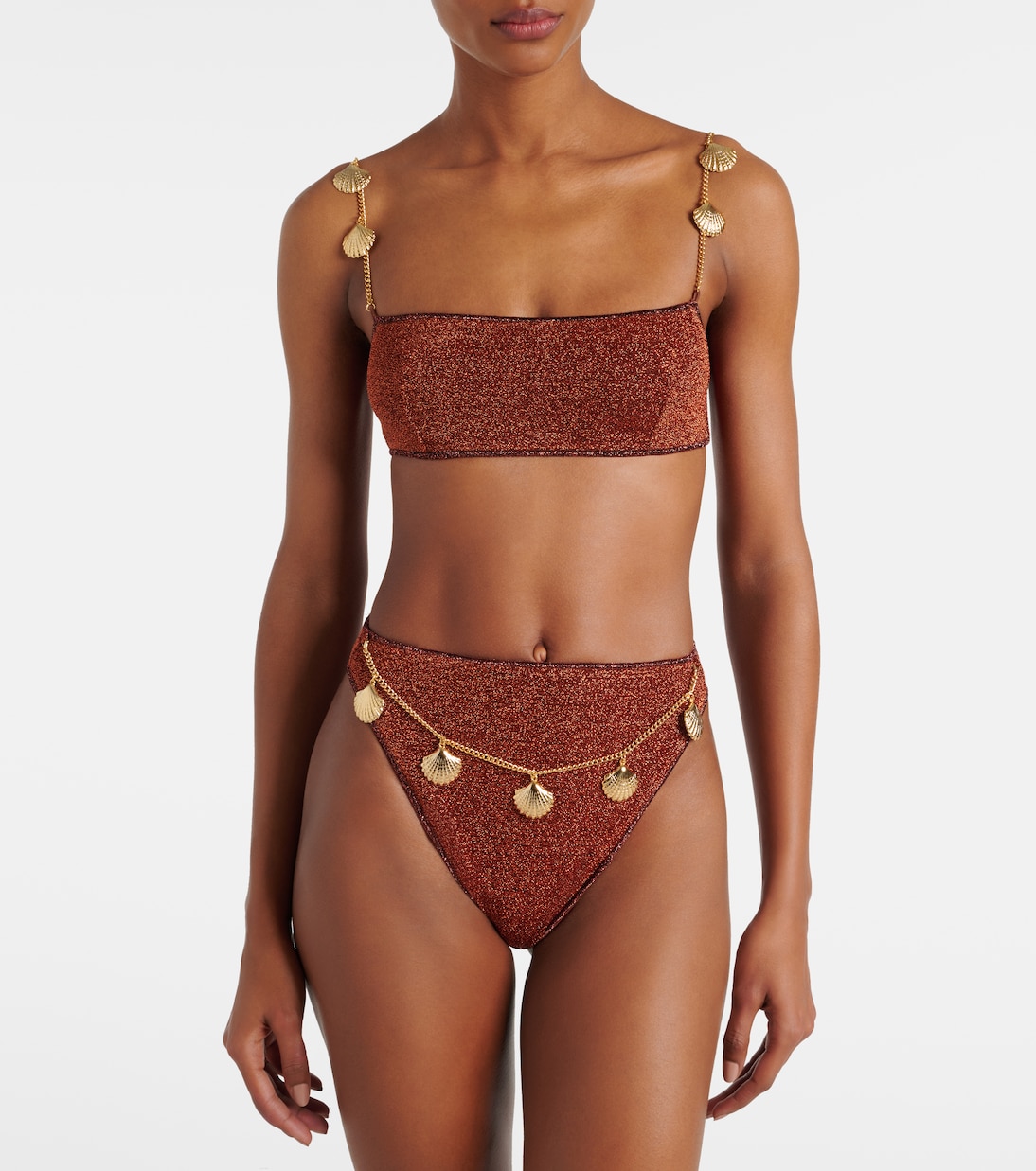 Это бикини сшито из ткани Lumière от Oséree, прошитой тончайшими металлическими нитями для создания уникального мерцающего эффекта. Оно дополнено поясом и украшено ракушками.
