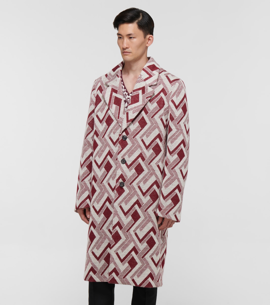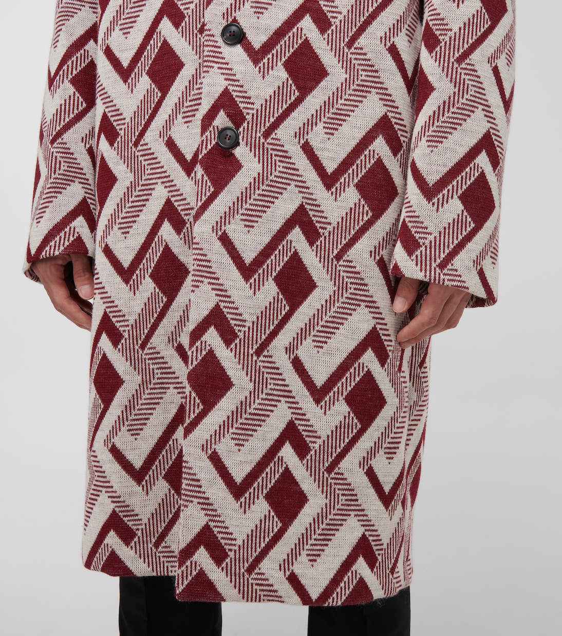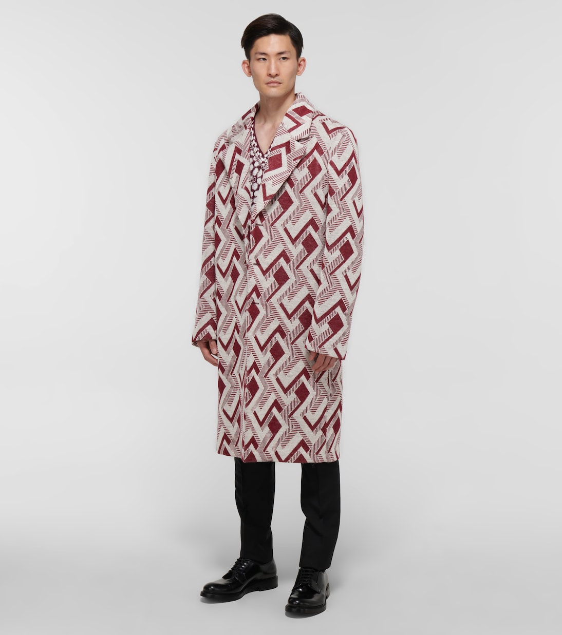 Это бордовое пальто от Prada, сотканное жаккардом из натуральной шерсти, украшено геометрическим узором по всей поверхности. Удлинённый силуэт, широкие отложные лацканы и однобортный перед с застёжкой на пуговицы.