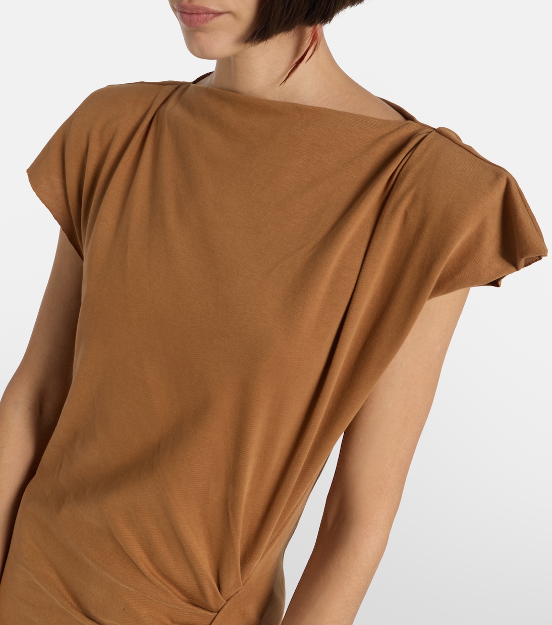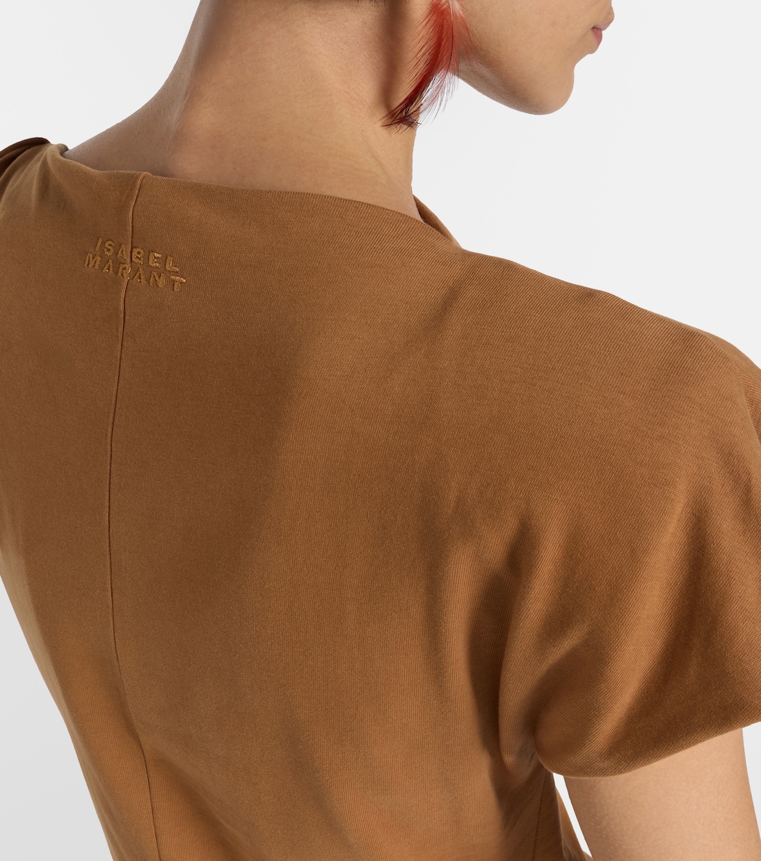 Платье макси Nadela от Isabel Marant, выполненное из хлопкового трикотажа, отличается сборками и съёмными подплечниками. Платье имеет приталенный силуэт и высокий разрез до бедра спереди.