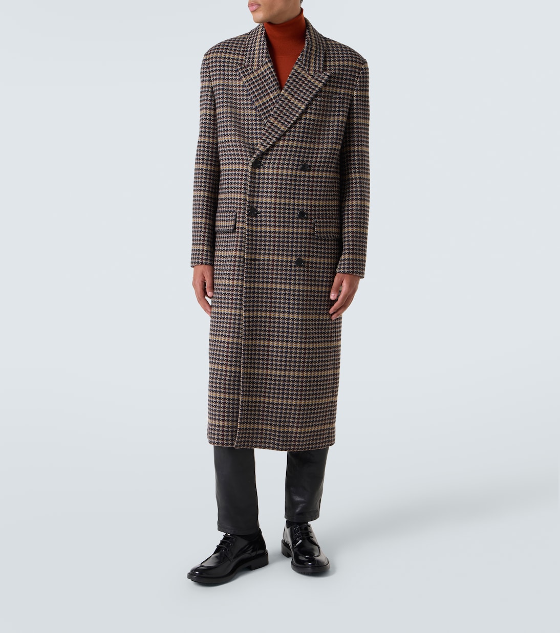 Это двубортное пальто от Saint Laurent, воплощающее в себе непреходящую элегантность, изготовлено из мягкой шерсти. Изделие украшено узором «гусиная лапка», имеет заостренные лацканы и плоские карманы, что придает ему изысканный, элегантный вид.