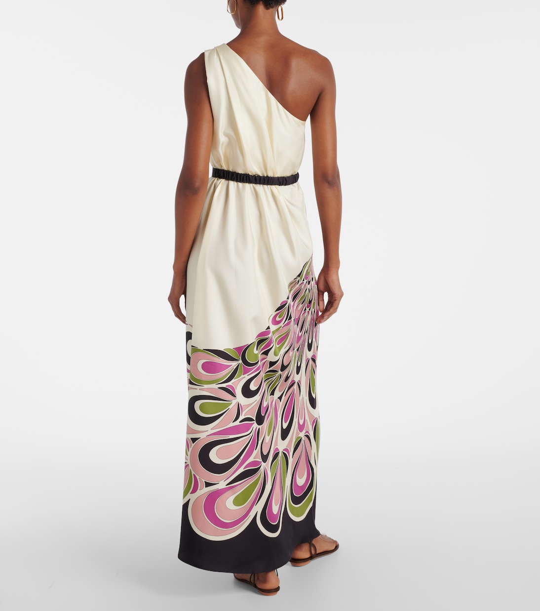 Платье макси Roy от La DoubleJ излучает воздушную красоту благодаря силуэту на одно плечо. Этот откровенный фасон, выполненный из струящегося шелкового твила, дополнен ярким принтом по всей поверхности.