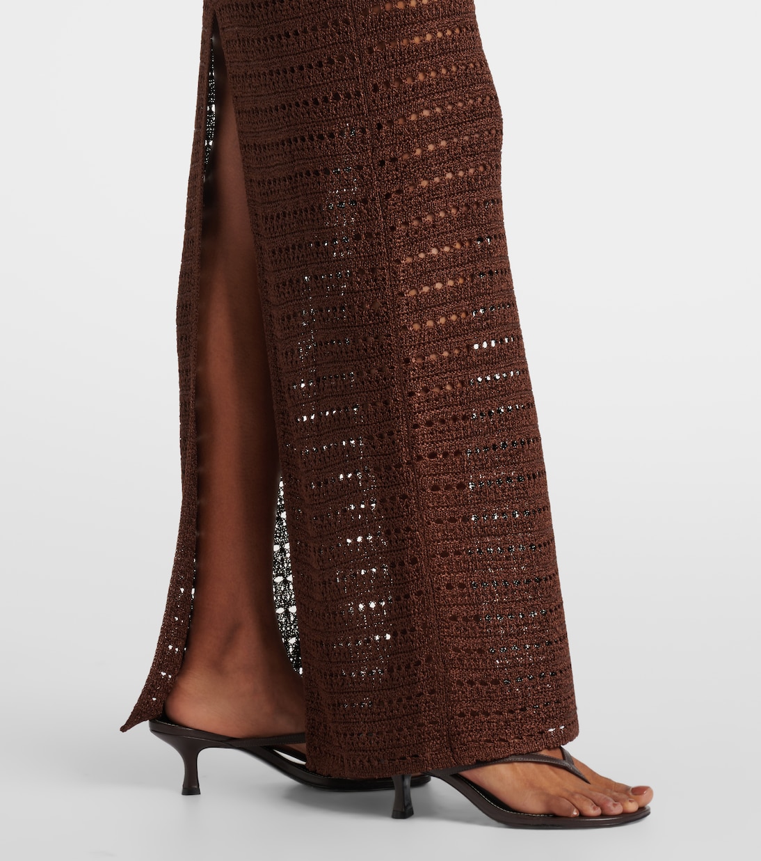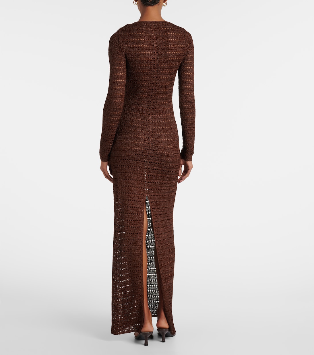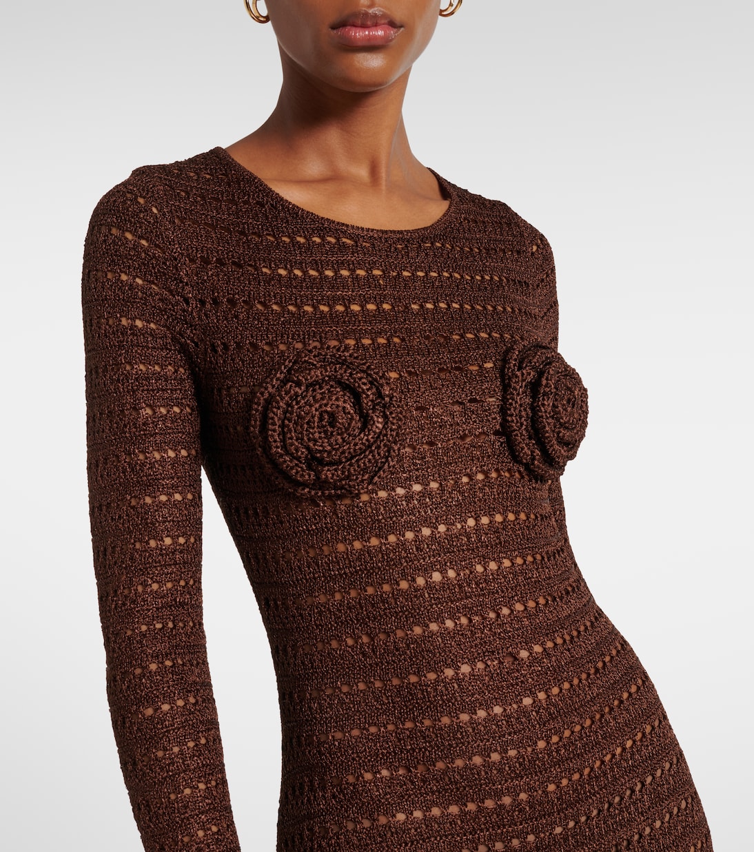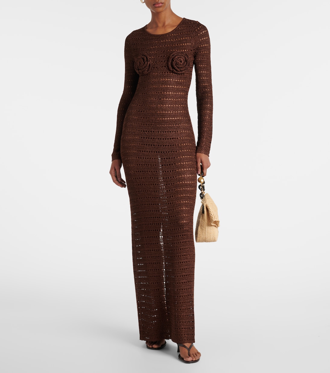 Это длинное платье Same, одновременно элегантное и соблазнительное, связано крючком в полоску. Платье длиной до пола выполнено в насыщенном шоколадно-коричневом цвете и дополнено цветочными аппликациями на груди.