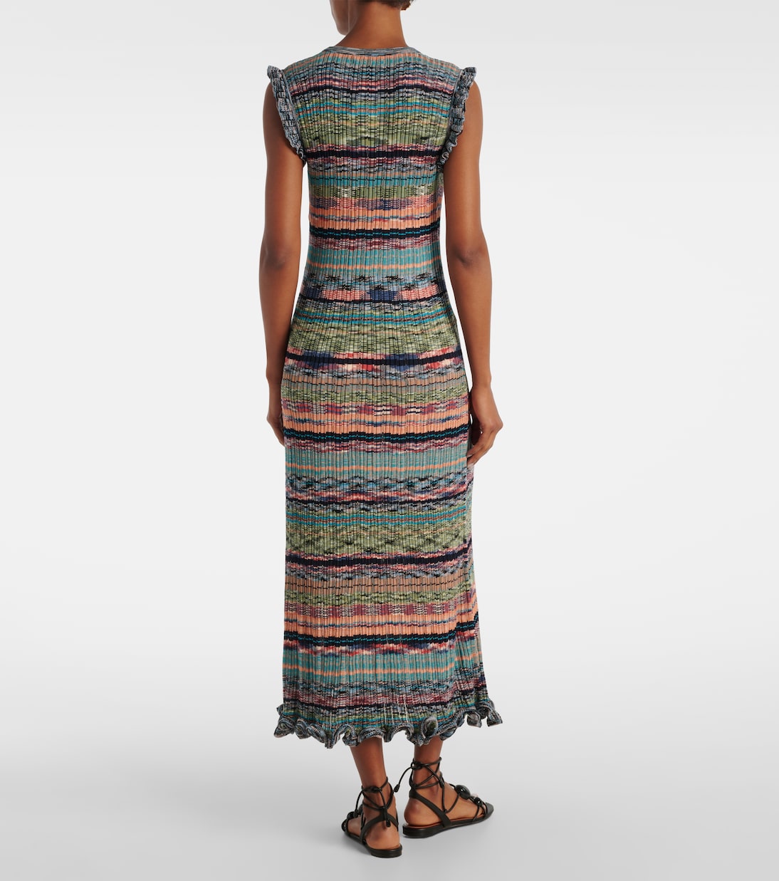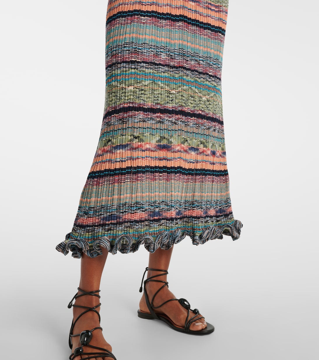 Платье миди Ajak от Ulla Johnson связано в рубчик с очаровательным красочным полосатым узором и имеет облегающий силуэт. Модель дополнена круглым вырезом и изящной оборкой на рукавах и подоле.