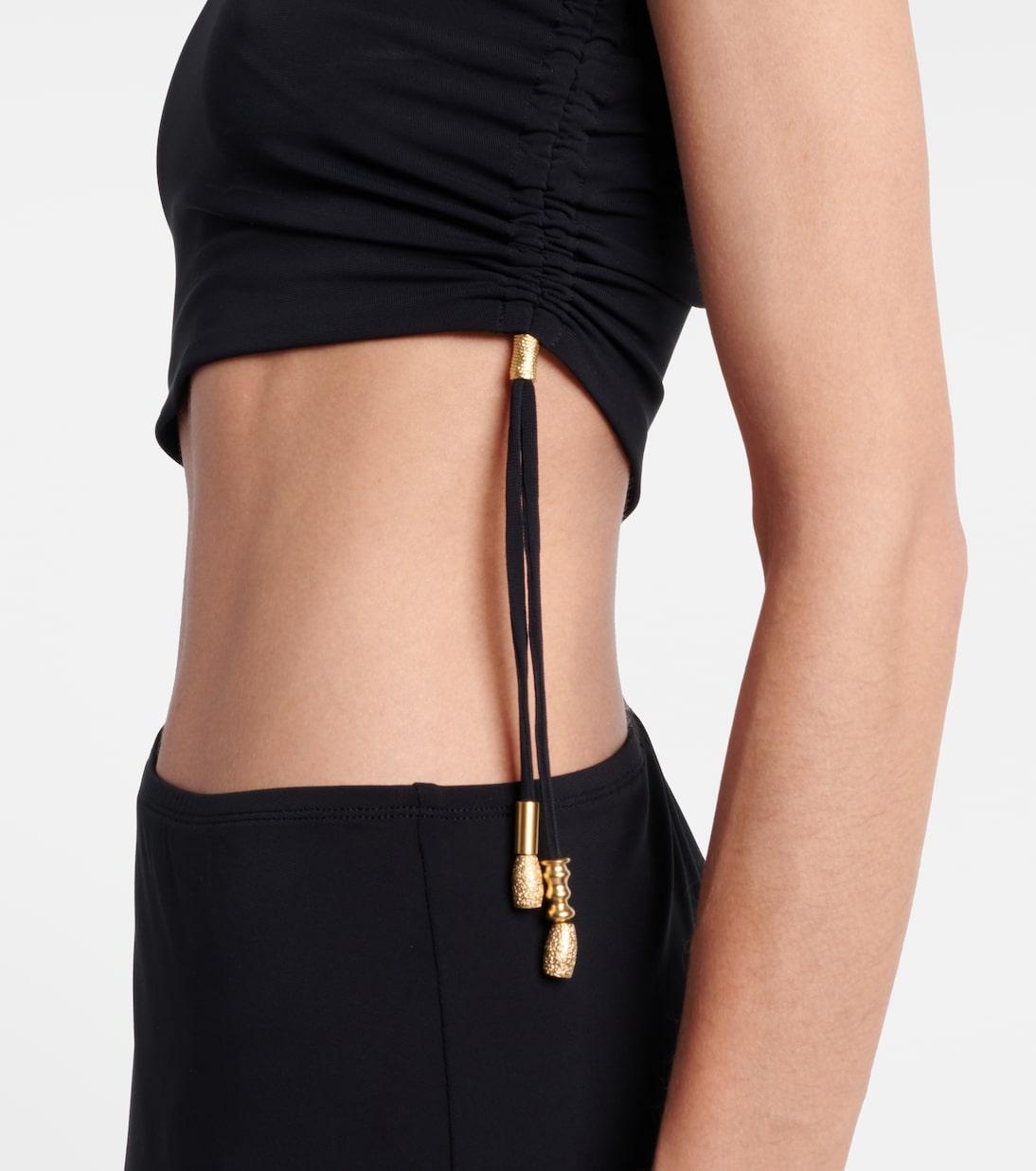Платье миди Eres Legende асимметричного кроя с вырезом на одно плечо и вырезом на талии. Модель дополнена завязками по бокам, украшенными позолоченными бусинами.