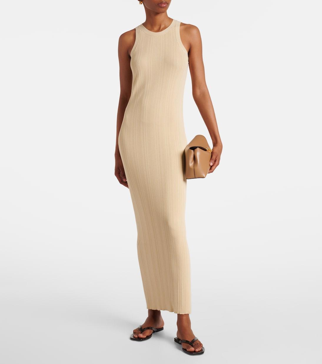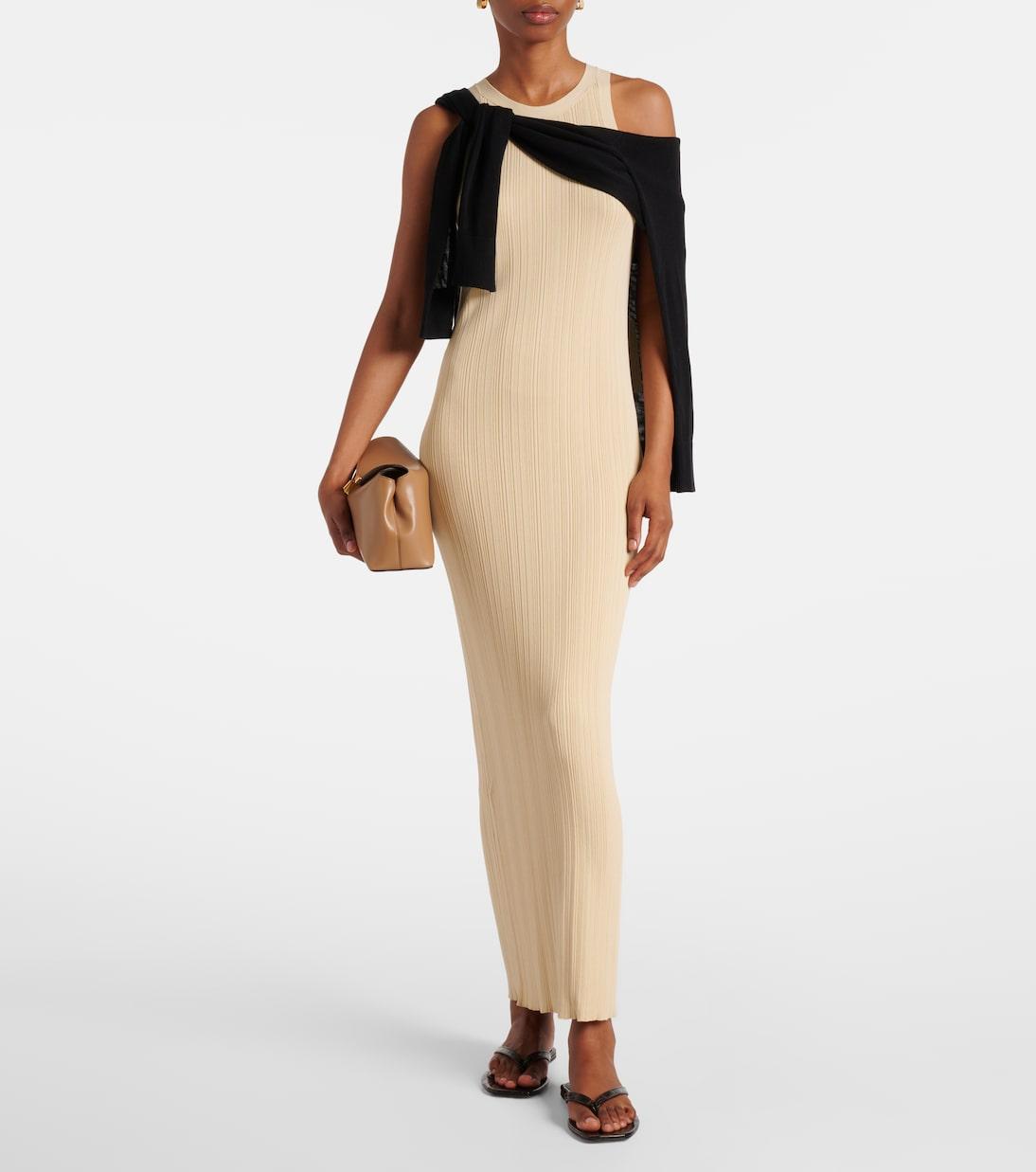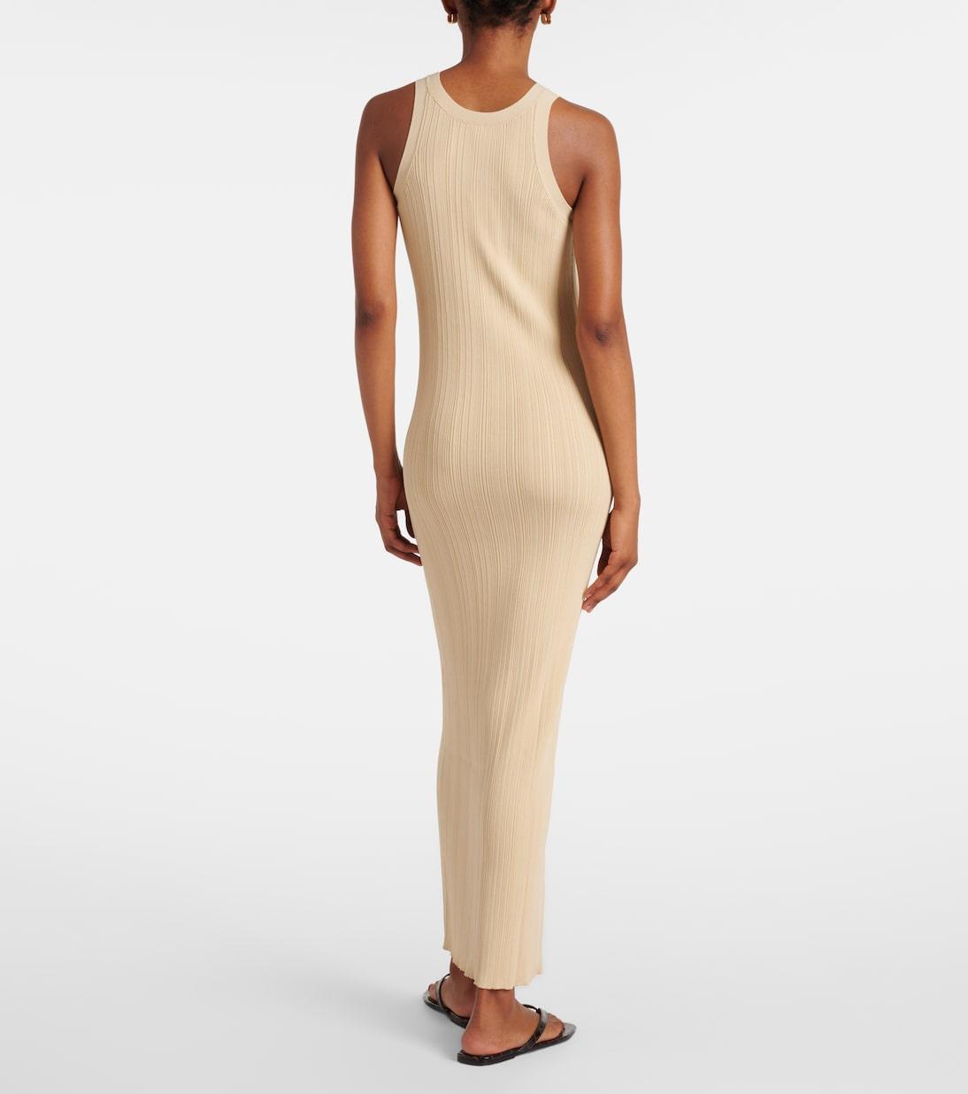 Это макси-платье от Toteme прямого, облегающего силуэта с изогнутыми проймами и круглым вырезом. Платье выполнено из ультраэластичного трикотажа с лёгким ребристым узором, которое обеспечивает структуру и комфорт в минималистичном стиле.