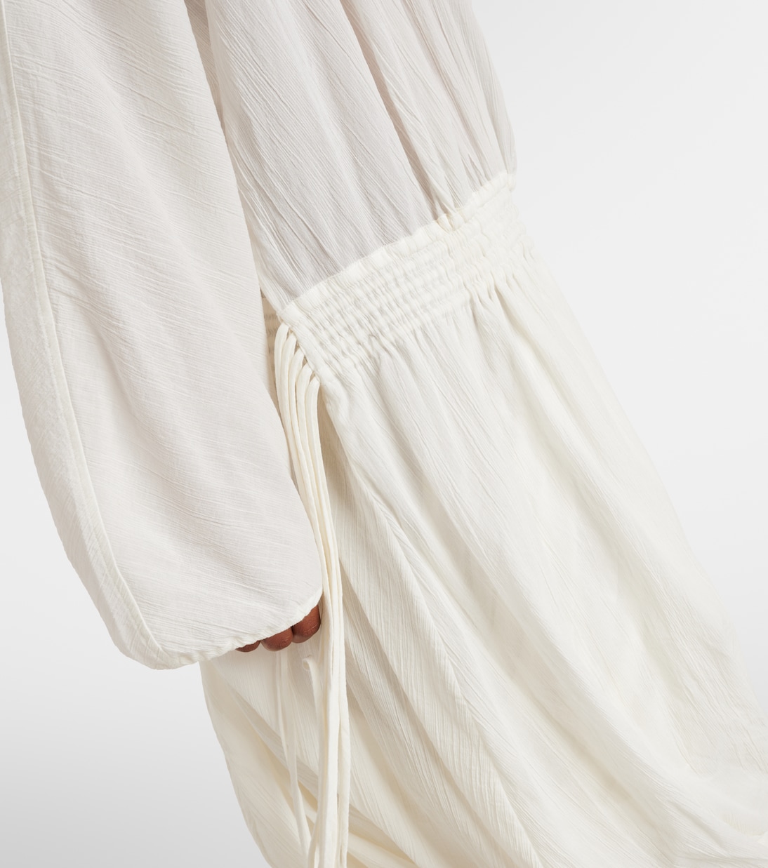 Это мини-платье Toteme подойдет для любого дня на пляже, ужина на закате или городской прогулки. Это белое платье из ультралегкого жатого хлопка с кулиской на талии и V-образным вырезом на завязках.