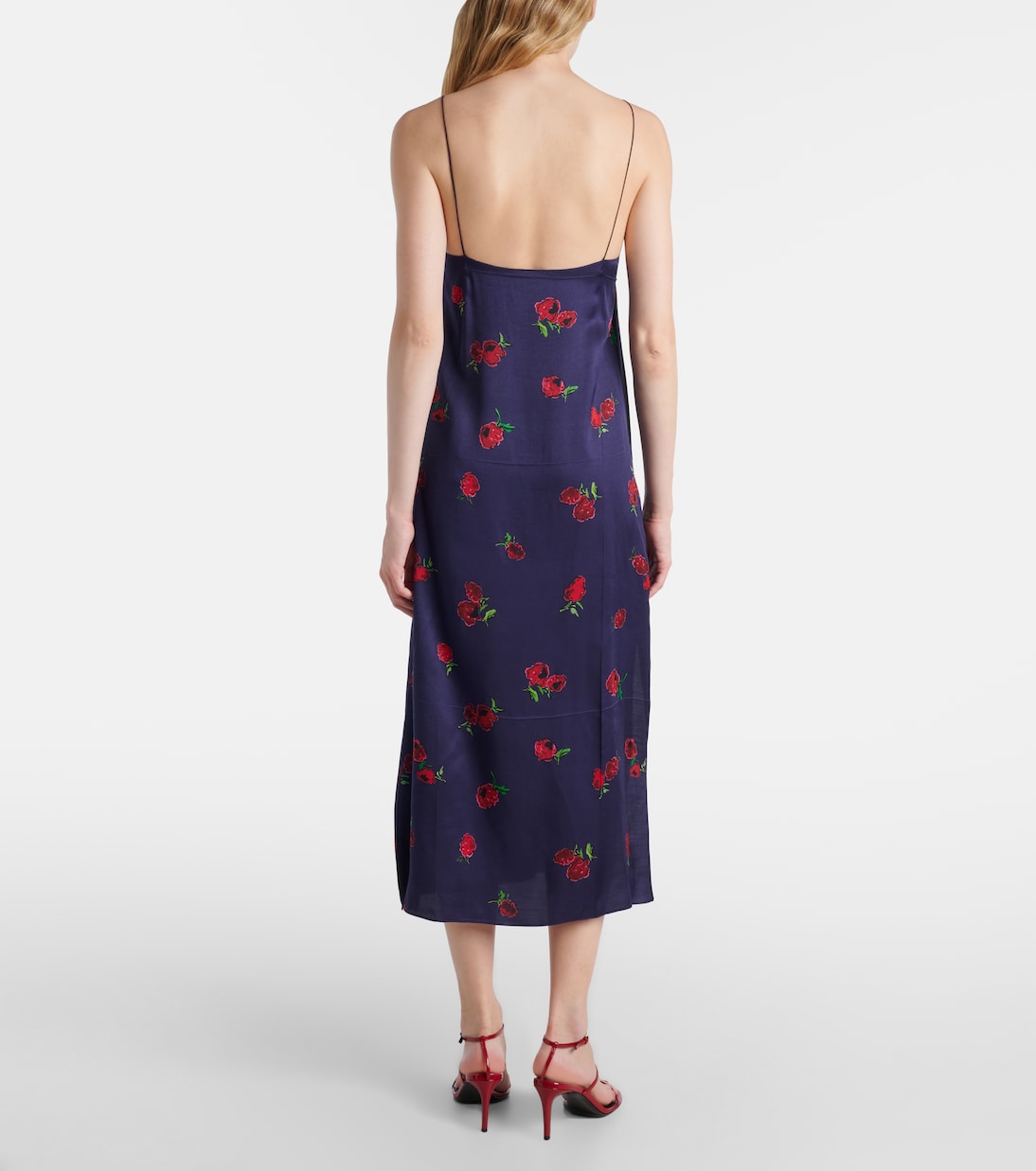 Платье-комбинация Sicily от Khaite, выполненное из шелковистой саржи, отличается струящимся силуэтом длиной чуть ниже колен. Элегантный дизайн дополняется заутюженными складками и очаровательным малиновым принтом по всей поверхности.