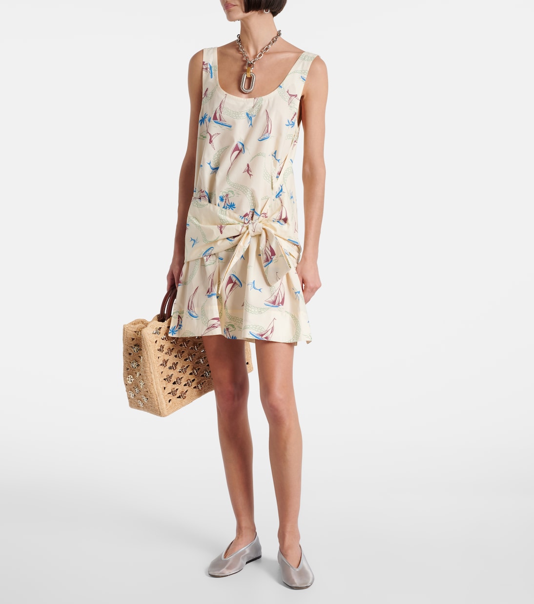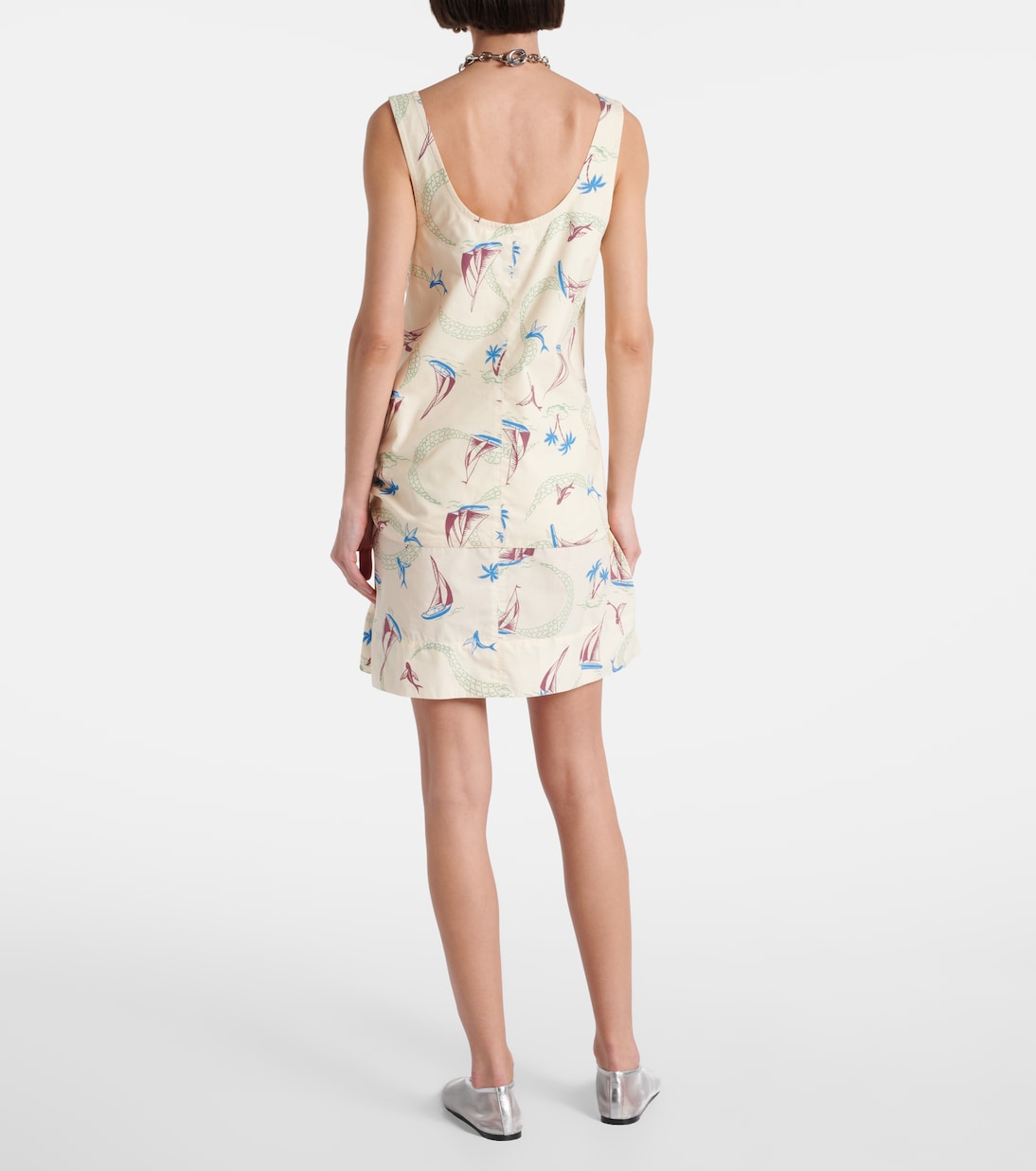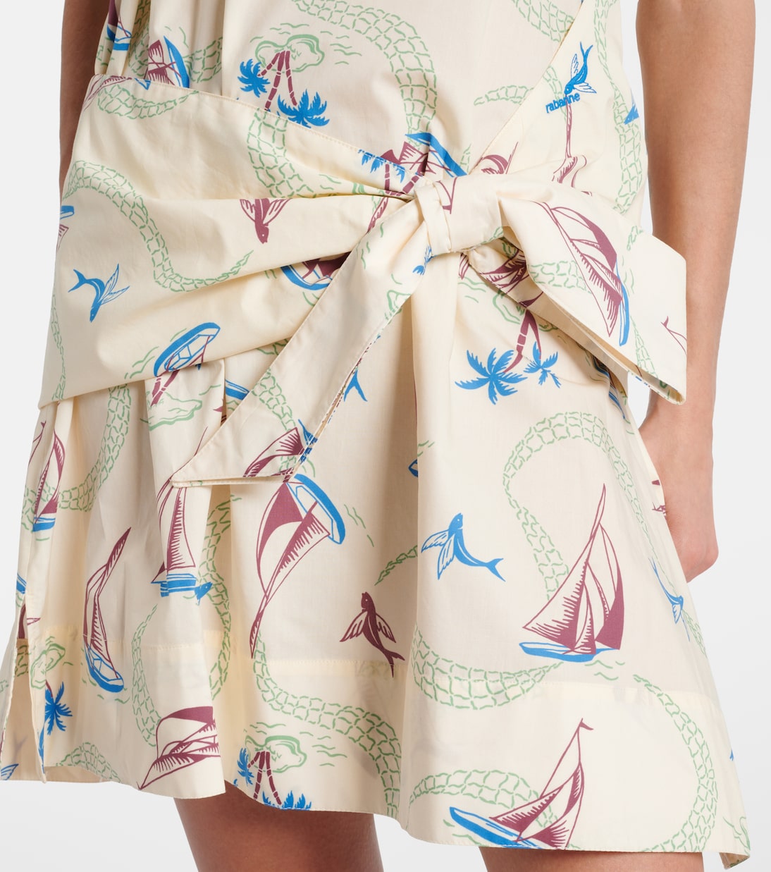 Это мини-платье от Rabanne выполнено из лёгкого, плотного хлопка с игривым принтом, вдохновлённым морской тематикой. Модель дополнена завязкой на талии.