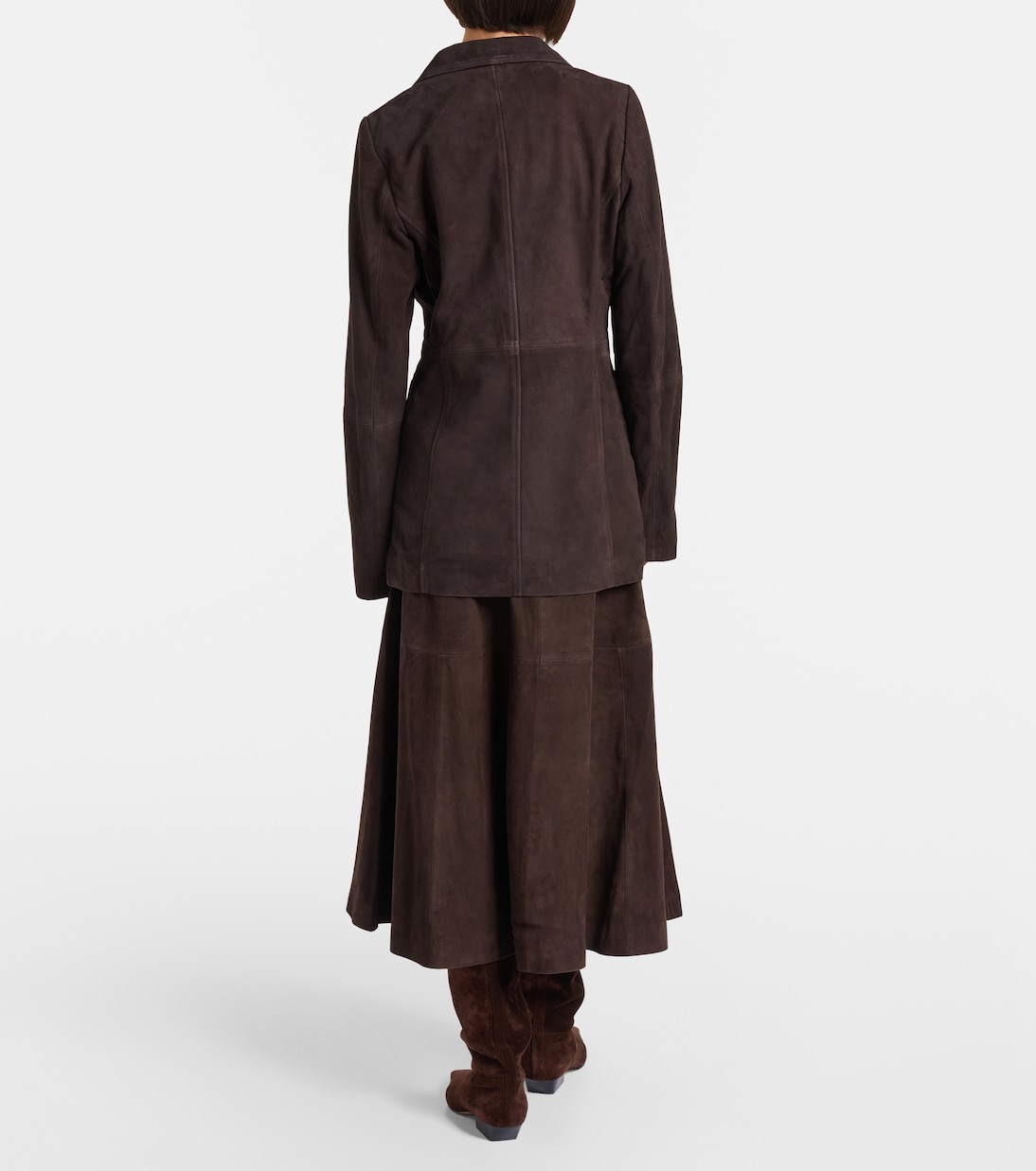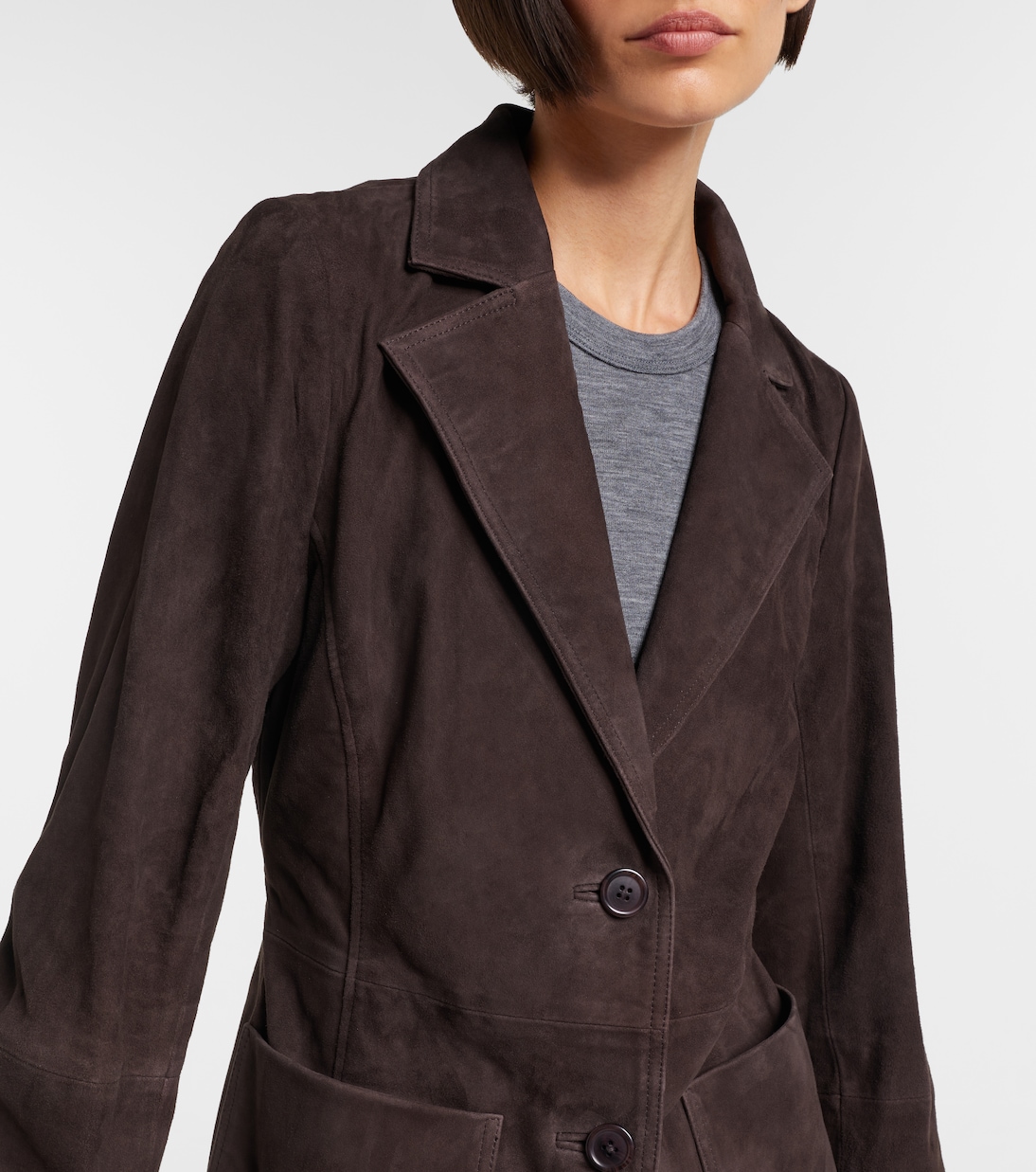 Это не просто блейзер, а модель от Róhe, выполненная из мягкой, как масло, замши. Однобортный силуэт подчеркивается приталенной талией и элегантными лацканами с заостренным воротом.