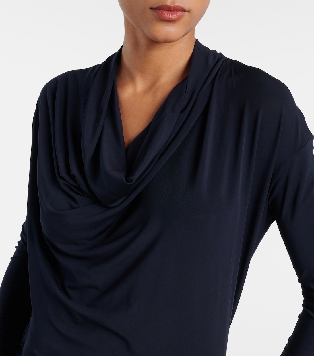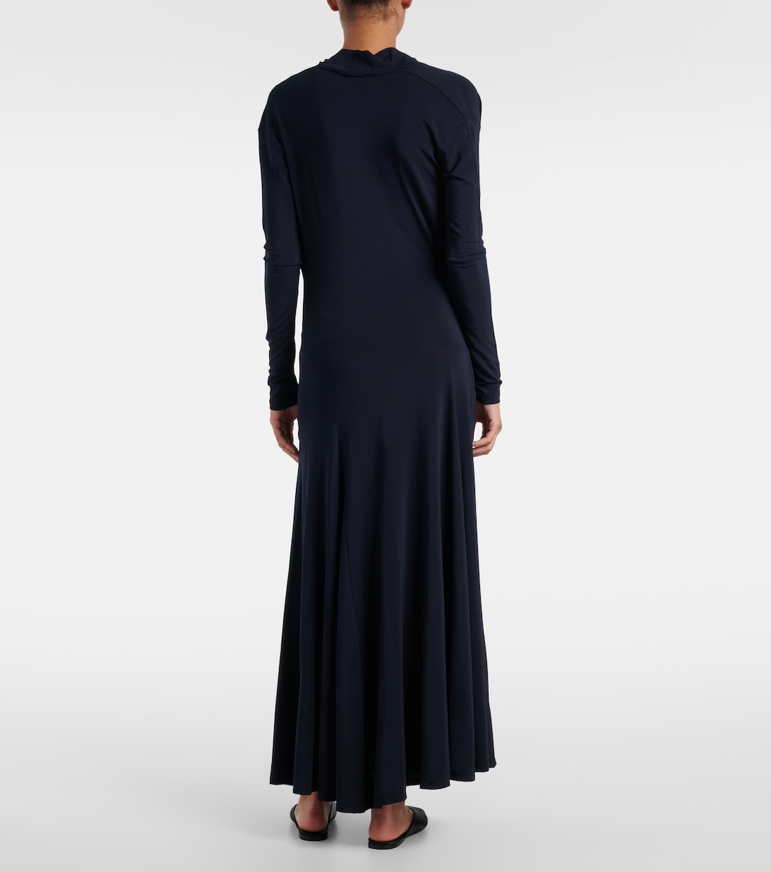 Платья из джерси с драпировкой — это фирменный стиль Туве, известный своими струящимися линиями и сдержанной элегантностью. Модель Eadan отличается глубоким вырезом-хомутиком и юбкой миди.