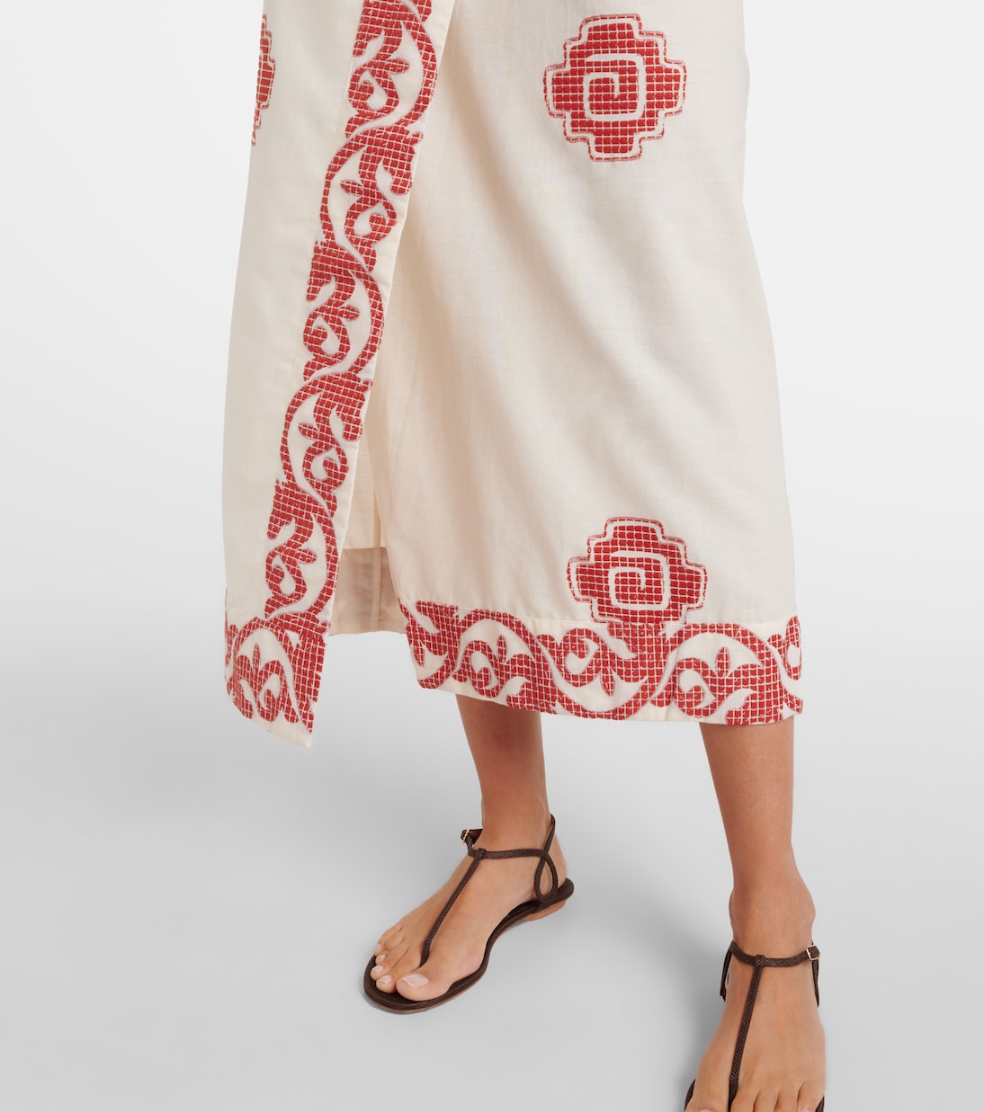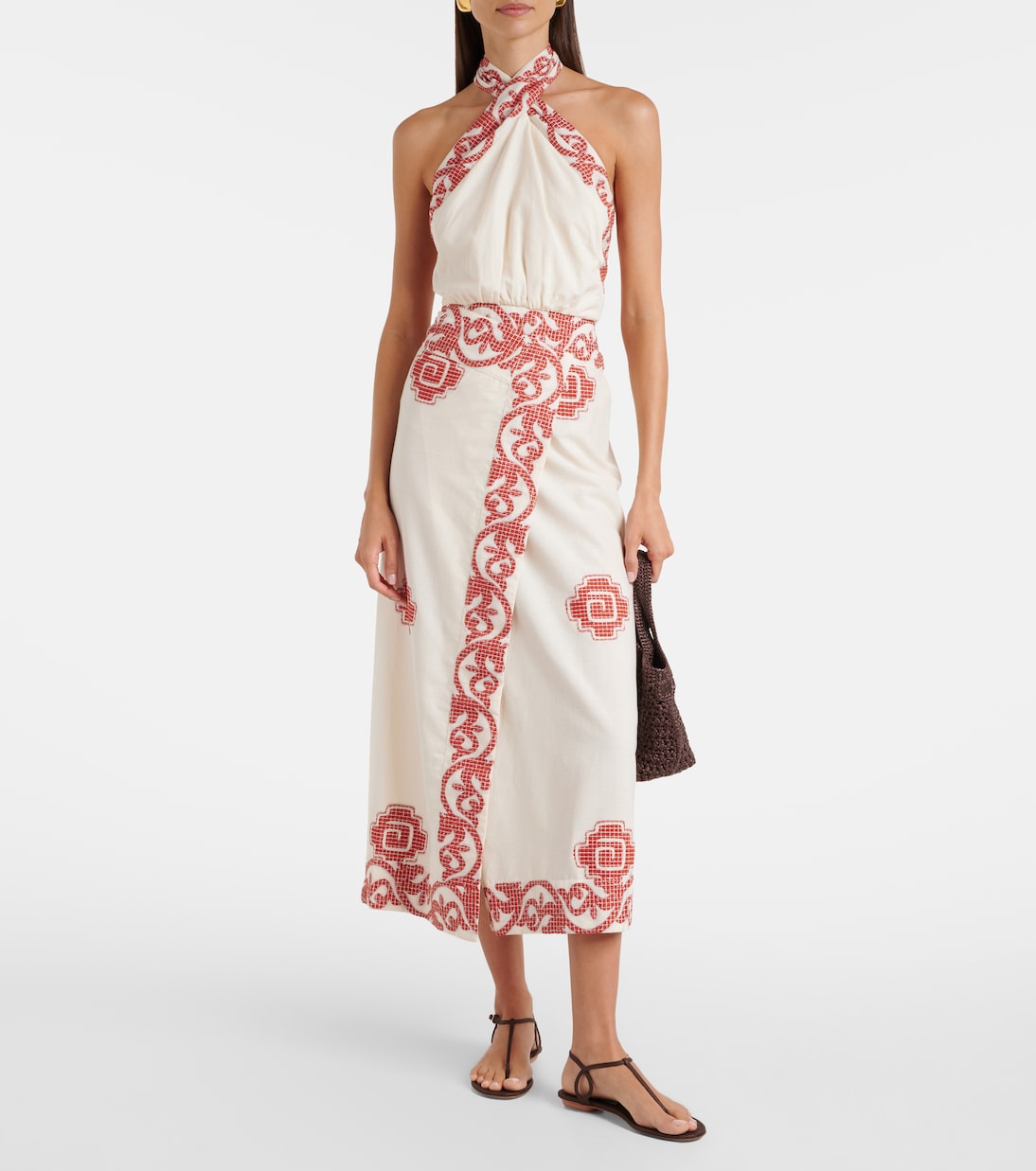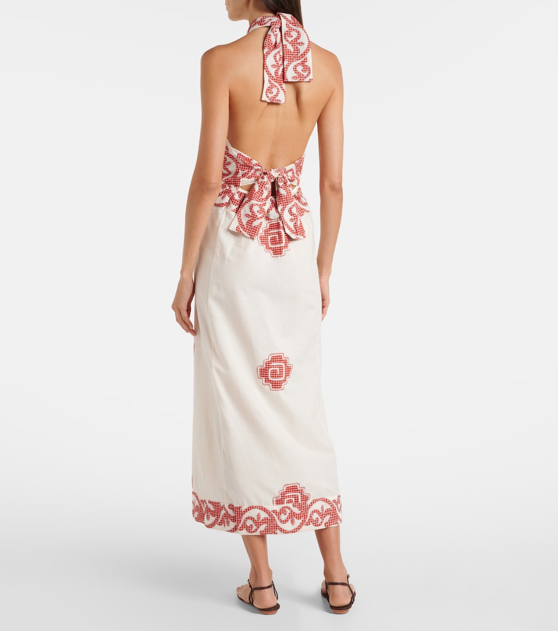 Это платье миди от Johanna Ortiz, обладающее многообещающим стилем, идеально подходит для теплой погоды. Открытая спина, халтер-ворот и изысканная вышивка придают ему изысканный вид.