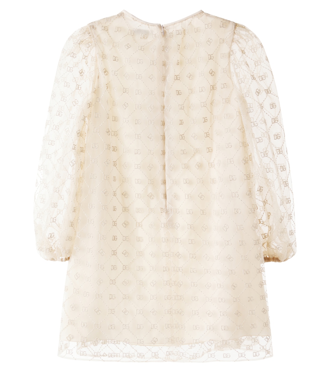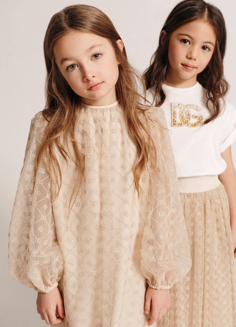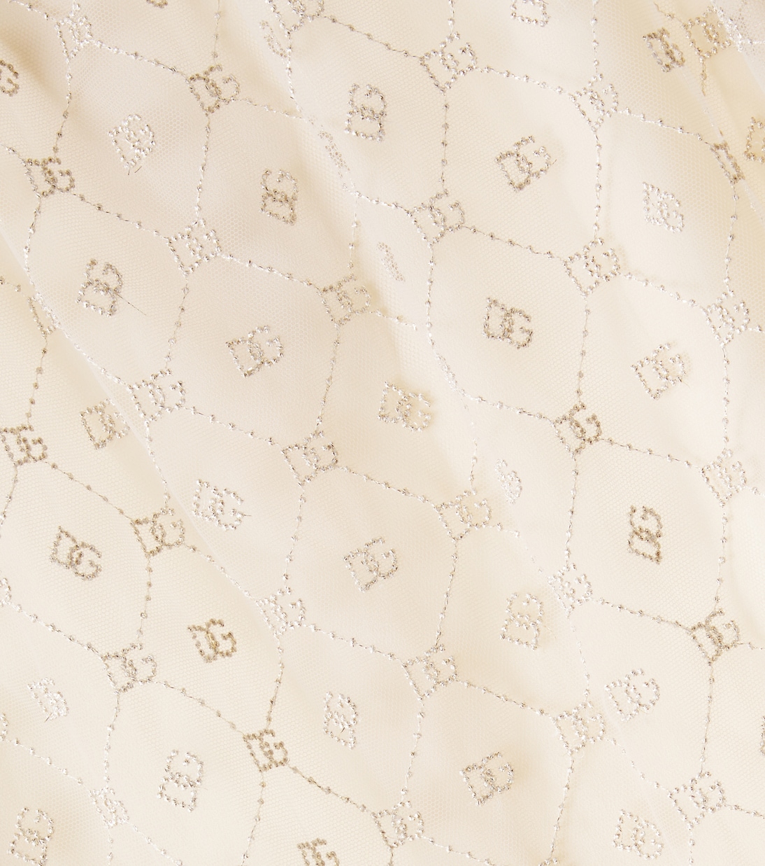 Это платье от Dolce&Gabbana Kids сочетает в себе фатиновый силуэт с мерцающими деталями из люрекса DG и подкладку из смесового шёлка. Этот праздничный дизайн отражает фирменный стиль бренда, предлагающий игривую элегантность и яркую одежду для торжественных случаев.