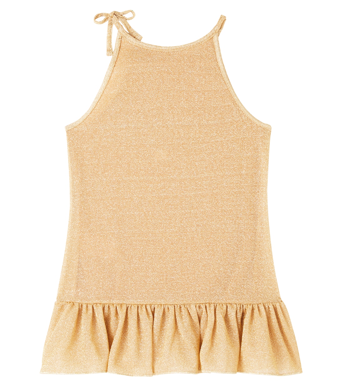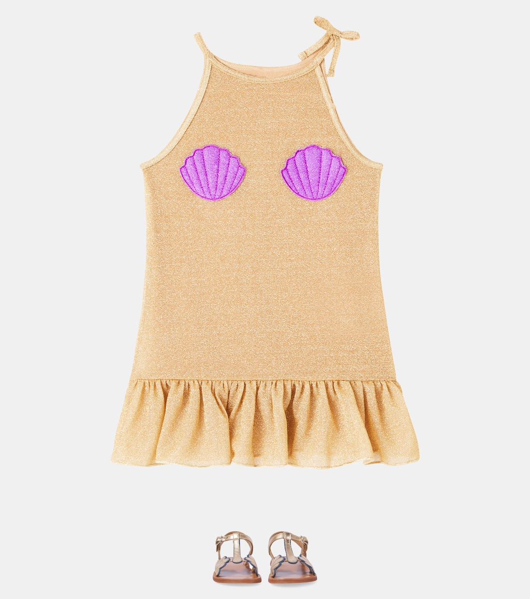 Это платье украшено деталями, напоминающими ракушки, на груди и оборкой по подолу. Модель выполнена из ткани Oséree Kids Lumière с добавлением тончайших металлизированных нитей для создания уникального мерцающего эффекта.