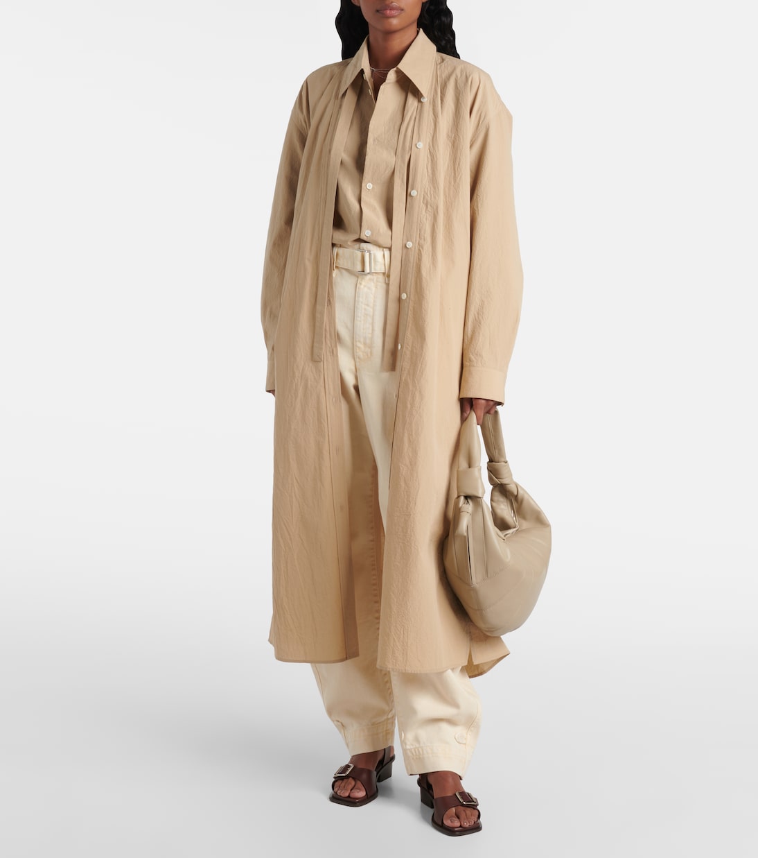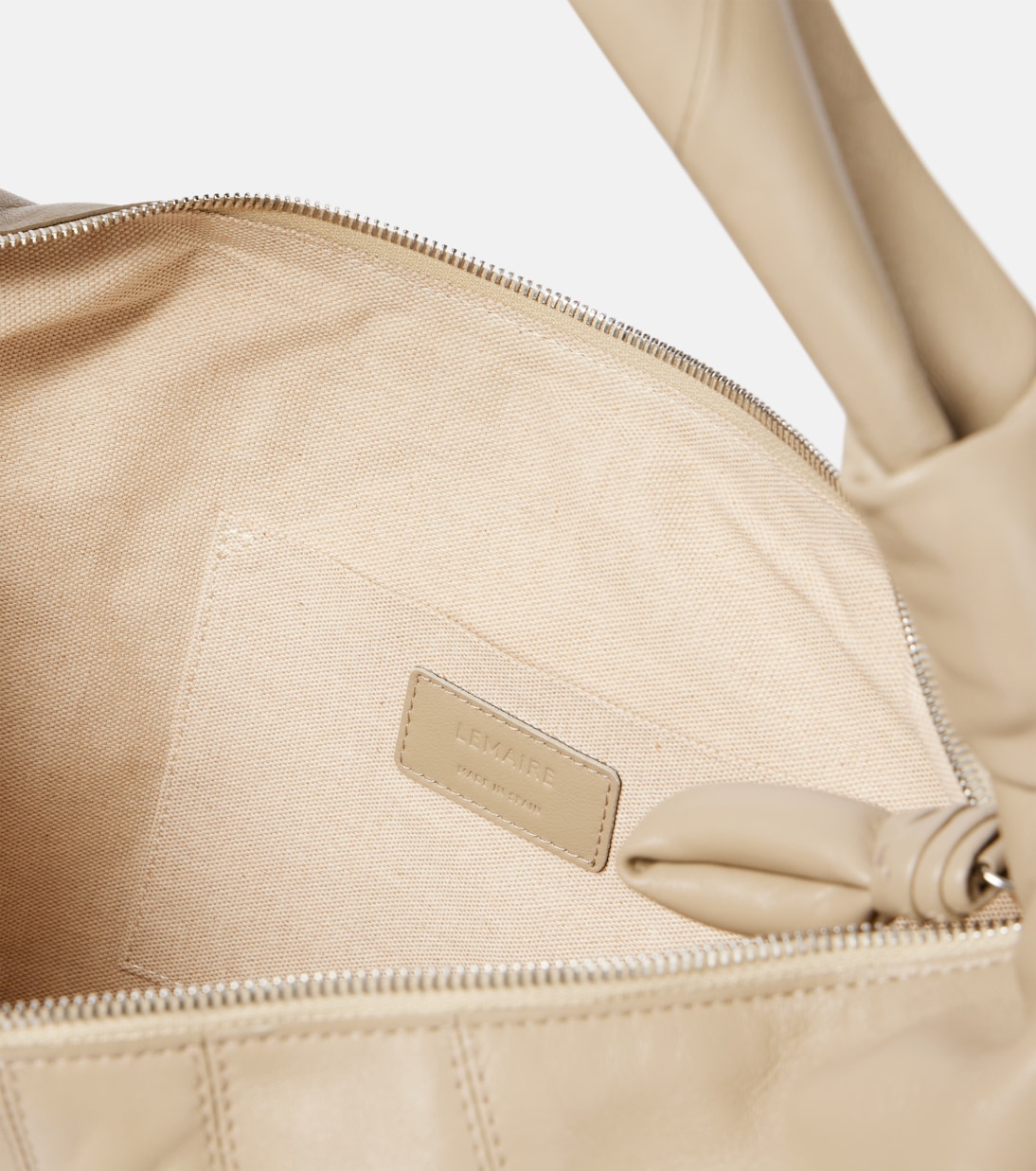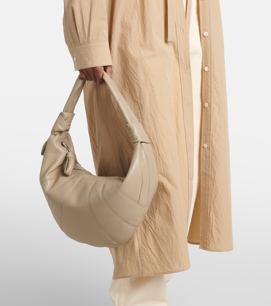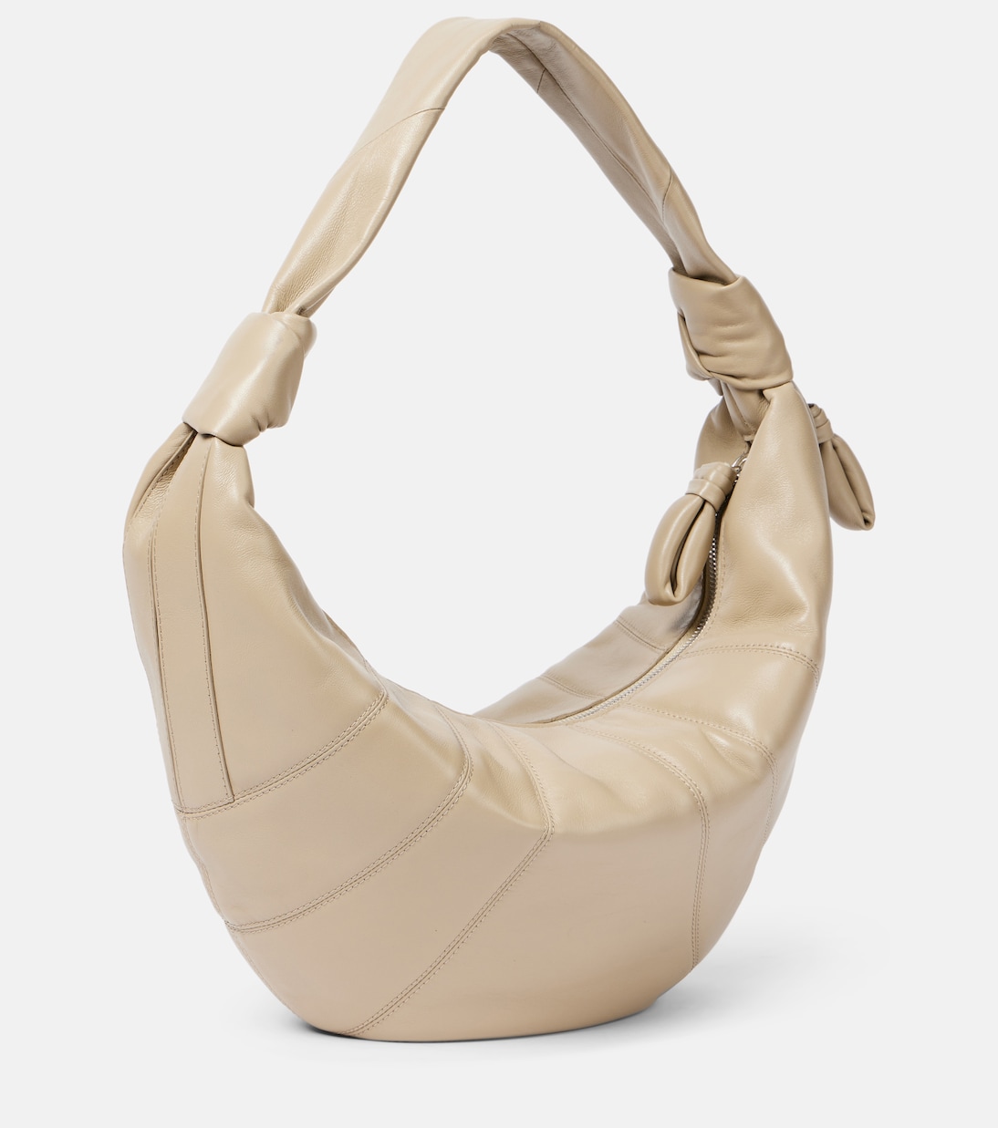 Встречайте свой новый любимый дизайн от Lemaire: сумку Fortune Croissant. Эта модель с завязанным на ремне плечом выполнена из бежевой кожи с декоративной строчкой, напоминающей фирменное пирожное.
