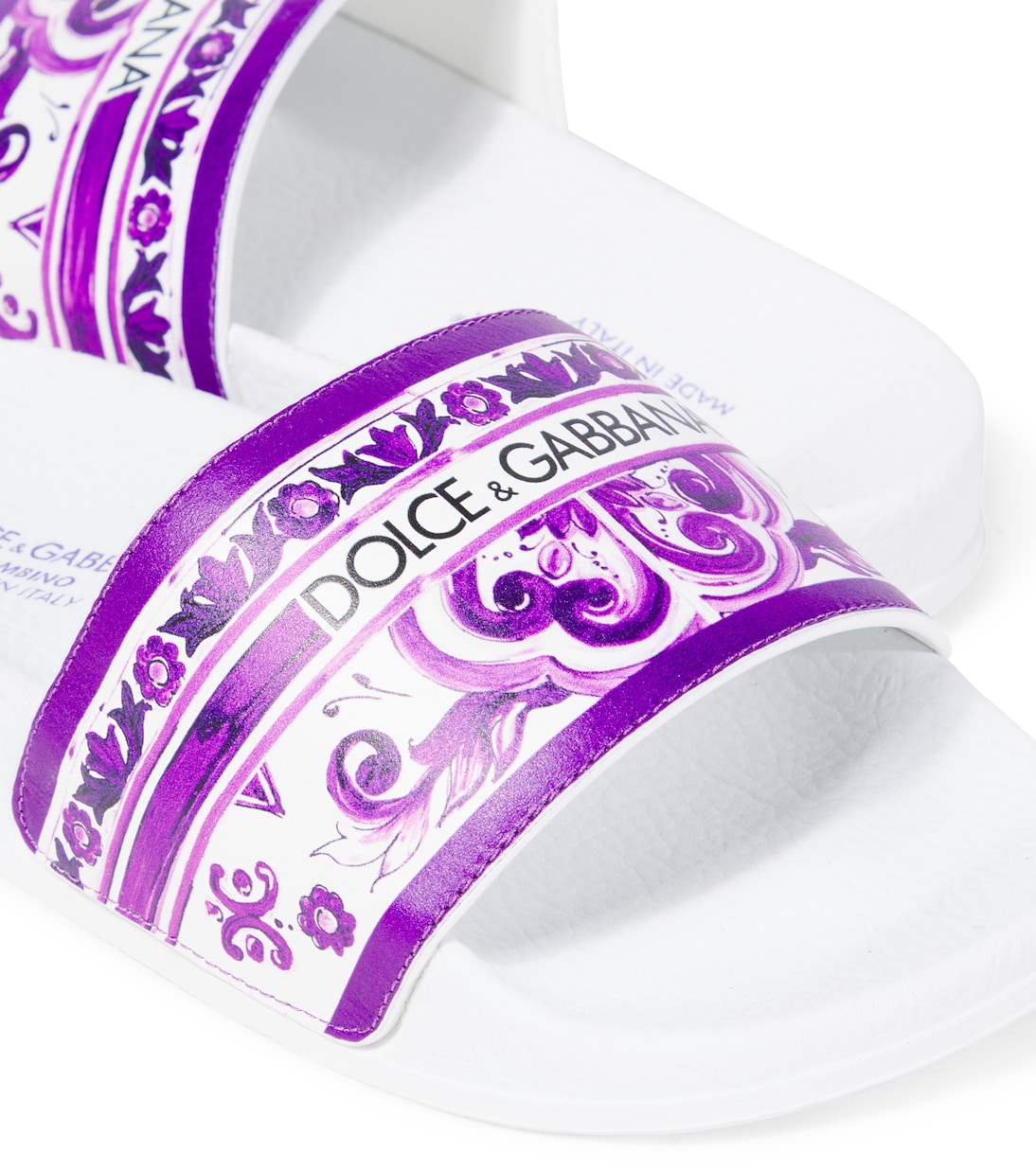 Подпитывайте свою любовь к итальянской моде с помощью детских моделей Dolce&Gabbana Kids в миниатюре. Эти кожаные шлёпанцы украшены культовым принтом бренда «майолика», вдохновлённым плиткой, и открытым миндалевидным носком.