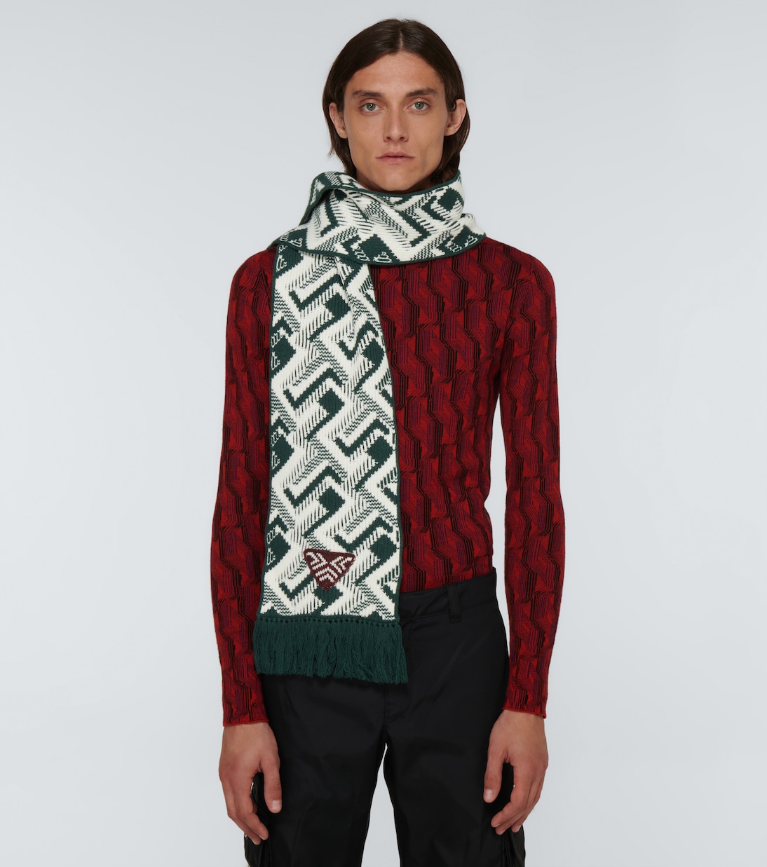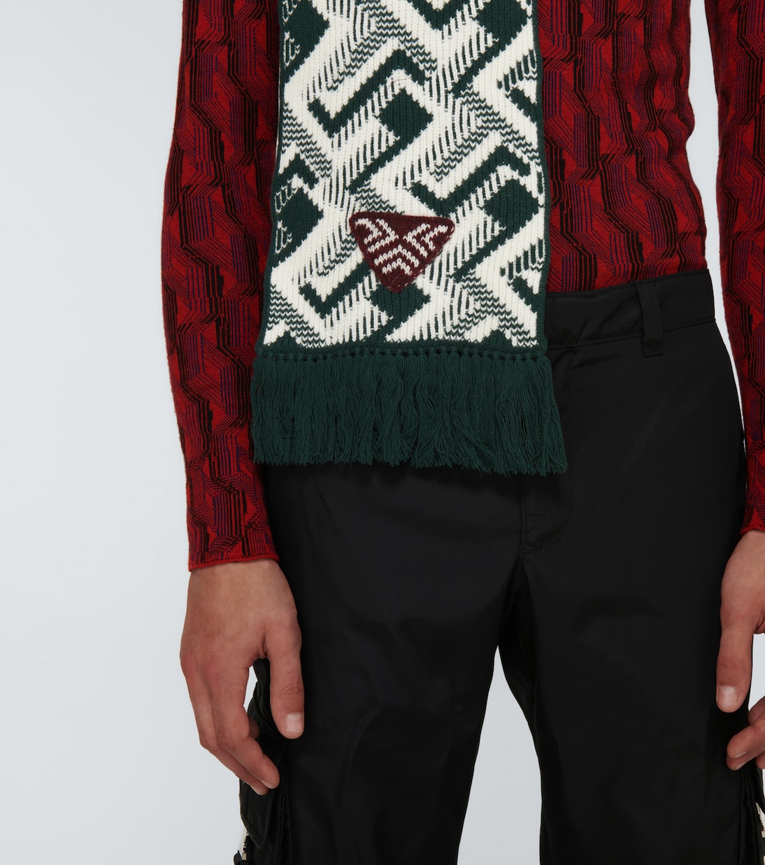 Этот бело-бутылочно-зеленый шарф от Prada, связанный из шерсти и кашемира с геометрическим жаккардовым узором, имеет бахрому по краям и вышитый треугольный логотип бренда на одном конце.