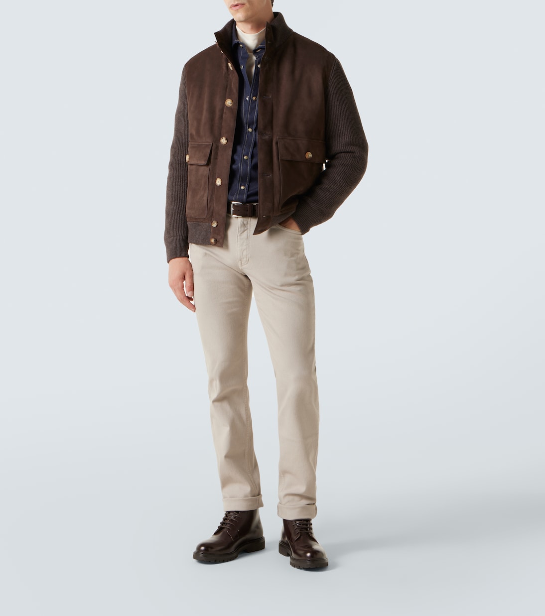 Этот блузон от Brunello Cucinelli имеет панельную конструкцию с замшевой передней частью и рукавами и отделкой из ребристой ткани. Эта уникальная модель с застежкой на пуговицы спереди добавит изысканности вашему образу для холодной погоды.