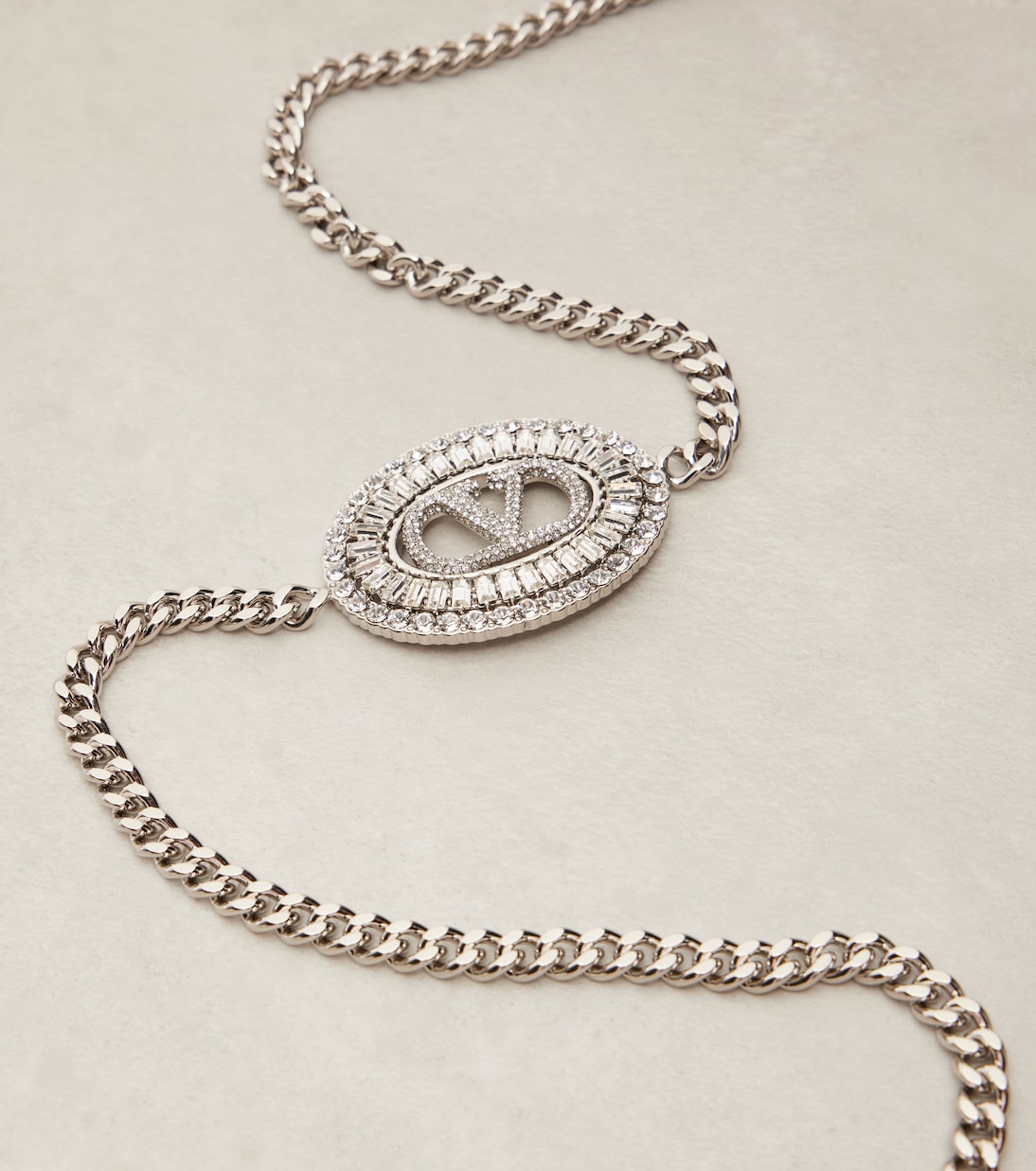 Этот гламурный ремень Valentino украшен фирменной монограммой VLogo и ослепительной оправой, украшенной кристаллами. Тонкие звенья цепи изготовлены в Италии из латуни, напоминая популярные силуэты 90-х.