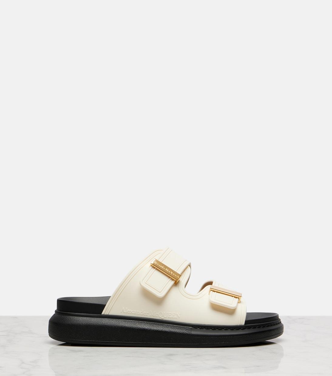 Гибридные сандалии от McQueen отличаются очаровательным контрастным белым верхом и чёрным основанием. Непринуждённый дизайн дополняют закруглённые носки, двойной ремешок и фирменные золотистые полоски бренда.